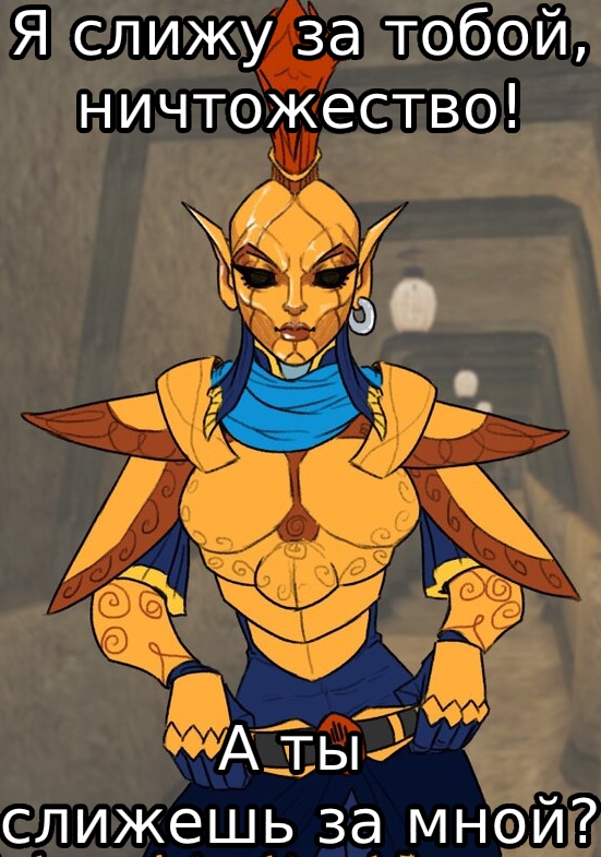 Уе, уе, уе! Я данмер, Я прибыл с Солстхейма, таща с поклажей мешки Там всё в пепле, как будто все курят Я данмер, И у меня нет башки, Мне отбили её братья бури