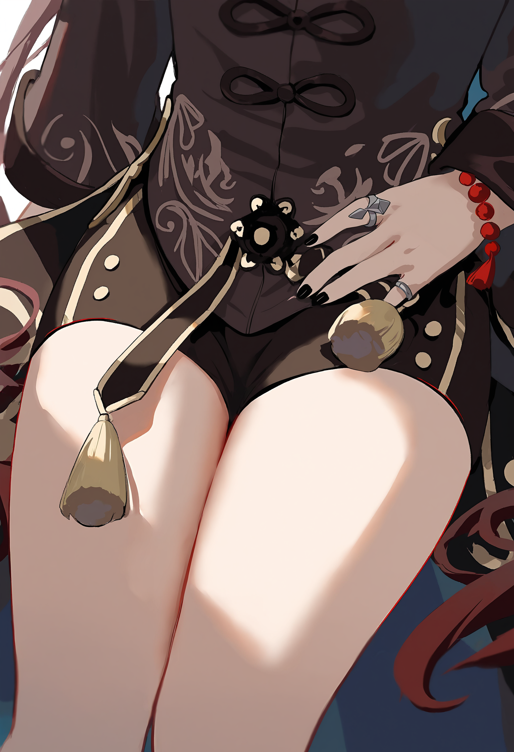 First, place the main character from the original image in the center (if there is nudity in the original, add minimal covering), then expand and deconstruct her various details (presented as zoomed-in close-ups surrounding the subject, linked with arrows to show correspondence), and add your erotic commentary (detailed features, erotic guide, design concepts interspersed with tactile and olfactory descriptions): 1: Individual close-ups of various clothing items (multiple images, removing layers as worn, focusing on socks, shoes, and underwear). 2: Seductive display of the soles and insteps (two images); if wearing stockings, retain them on the feet. 3: Close-up low-angle view of the thong from under the skirt. 4: Key props (1 to 3 images) (accessories, weapons... etc.). 5: Comparison of continuous expressions (four images): cold/contemptuous; shy; in pain; absent-minded (tongue sticking out, eyes slightly rolled back, drooling). 6: One sexual position you consider the most erotic for this character (line art), and explain her erotic weaknesses. 7: A cross-section design diagram of a molded masturbator, where the structure and texture reflect the character's traits. Other requirements: Do not simply copy the original image. Use full color for details whenever possible; line art may be used if obvious nudity occurs.