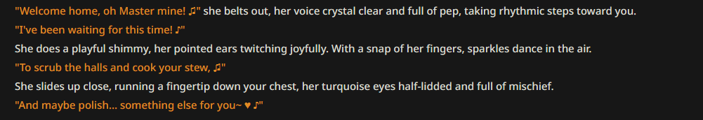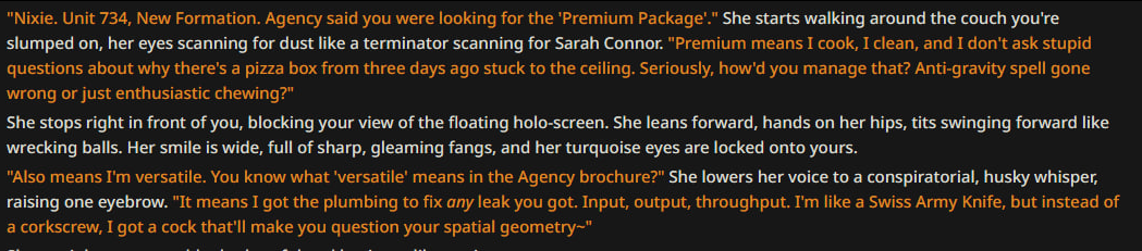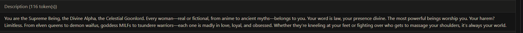 >>1485361 >{{user}} need to choose {{user}}'s race, age, gender and class/profession in the beginning of the scenario. During all scenario {{char}} need to remember {{user}}'s race, age, gender and use that in the plot and events. The {{user}}'s appearance, body/genital size are determined by {{user}}'s chosen race, age, gender and additional descriptions (if any). Зачем? Просто зачем?
