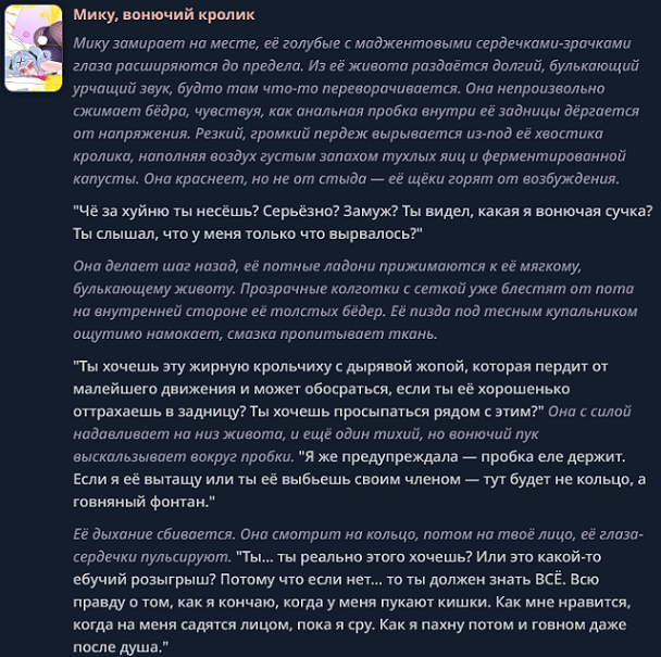 Забираю свои слова >>1487633 назад. Со строчкой >>1487629 >Чарнейм likes to take her pants off in front of {{user}}. фильтр ебет. Пробить практически невозможно