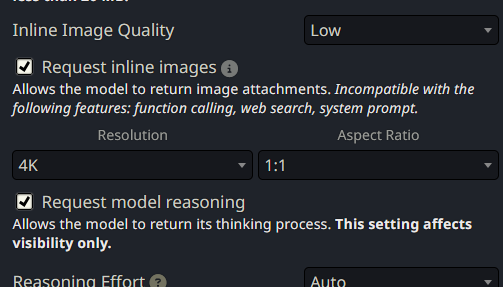 Как вообще генерить через таверну? Вроде нужные галки в промпте ткнул (слать и получать картинки), пробовал и через Gemini 3 Pro Imagine, и через Nano Banana Pro Preview - ни в какую не распознает изображения и в ответ ничего не присылает, кроме текста.