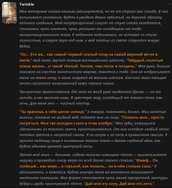 >>1485362 Надо было в прошлом треде активнее постить, чтобы быстрее перекатить, а то кидать карту под конец треда такое себе. >>1485364 Чтобы юзер мог сам себе создать персонажа за которого хочет играть. Кто-то там жаловался что я прописывал юзера постоянно, теперь в некоторых карточках будете сами персонажа создавать для рп. Только выиграли. в карточках где юзер будет сюжетно важен буду и дальше прописывать юзера сам