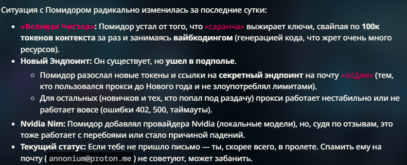 блин ну подскажите пожалуста ну не игнорируйте :( у меня рентри помидора weight-sales... не открывается, это у меня что-то или у всех? ответы в таверне тоже не генерятся мол ендпоинт не найдет. думал токен ревокнули сначала а я даже чекнуть его не могу ниче не грузит