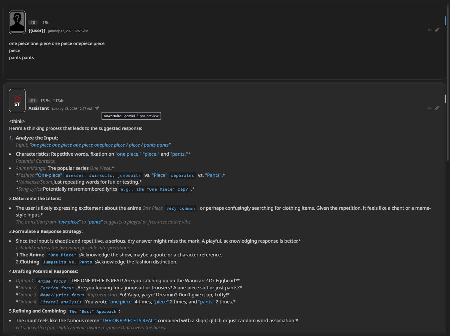 вообще, я вчера ебался со структурой сообщения, хочу поизучать на какие слова 3 гемини генерит больше слопа, на какие меньше, че он понимает и куда лучше тыкать промпты