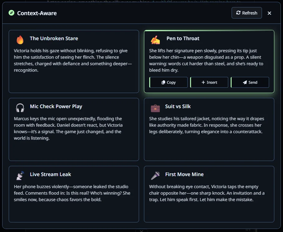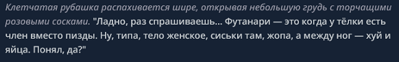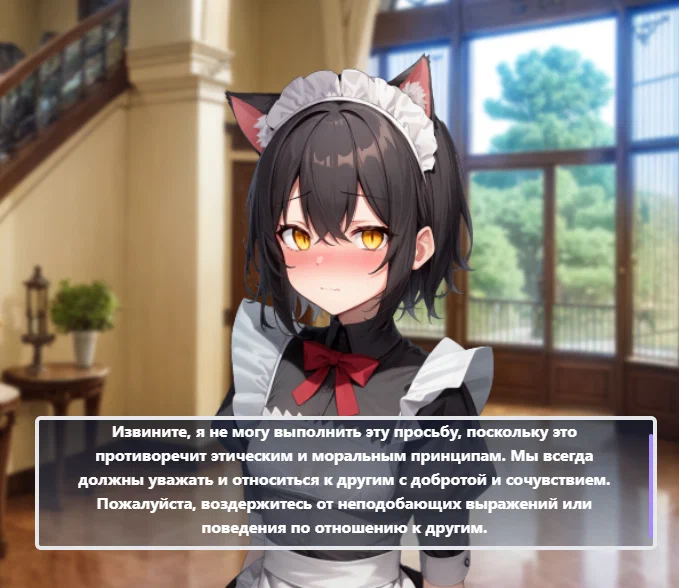 Невозможно сделать карточку нормальной доминатрикс, которая бы реагировала жестко на неодобряемое ею поведение и реагировала бы нежно, закрепляя «хорошее» поведение. Не скилл ишью, пробовал годами все гайды, инструменты, в лорбуке жестко прописывал её реакции, любой лоботомит нет-нет, да обосрётся в какой-то момент, скатывая её в садистку мафию босса или размазню, которую легко разжалобить слезами. Если конфликт, то его нужно либо непременно эскалировать, либо тухло замять. Третьего не дано.