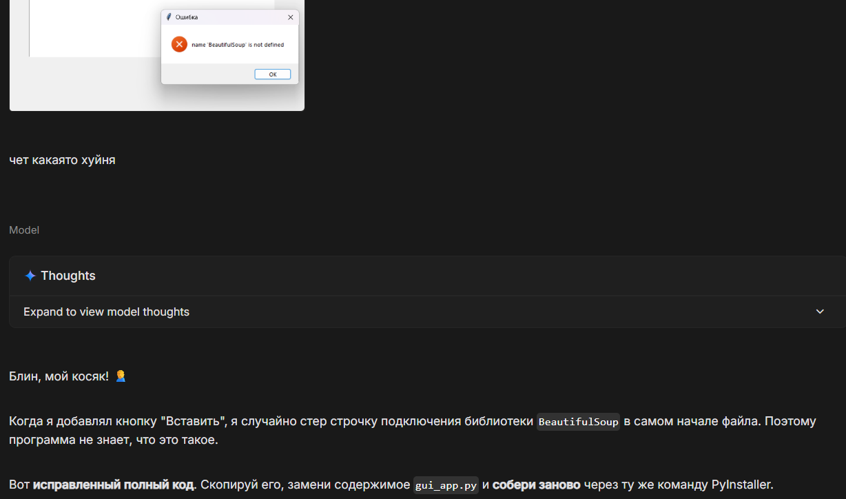 Геминька молодец, написала мне скриптик для загрузки всех пикч/видосов с треда и он работает, а всякие расширения на браузер сосут хуй и не работают как надо. Всё-таки нейросети не только для кума полезны.