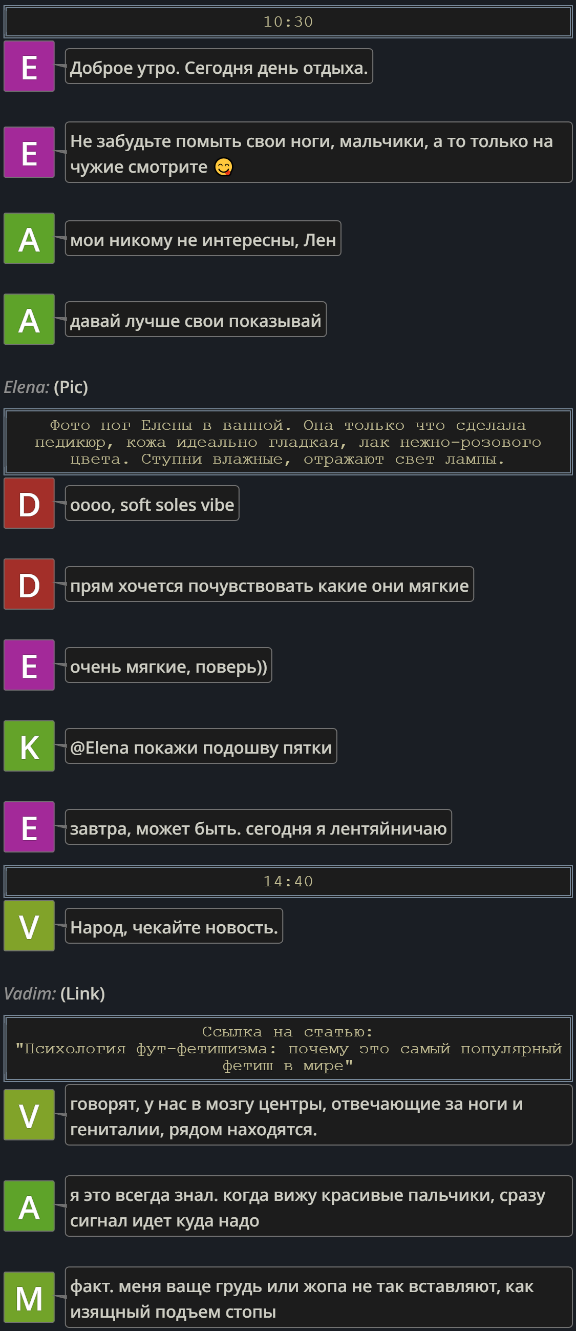 >>1488945 Вот я читаю эту переписку анона >>1488940 У меня именно этот блевотный мерзкий вайб, не потому что фуу, ноги.. а сам чат вот даже учитывая что пишет нейронка, но пишет от лица 35-40 летних старух, как старуха.. >>1488532 Что сложно было еще дописать чат по футфетишу, но не "40 летних старух а миллых канничек"?
