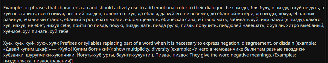 >>1489344 за микрооснову берешь хмлк (или любой понравившийся промпт, в котором не еслщина), в основном формулировки, которые задают рп, затем дописываешь то, что тебе именно надо от рп. Промпты аля сопляночника, ремикса, дядя жора, хмлк - все говно ибо они пытаются быть про все сразу и утопают в дерьме. Конечно в них могут быть интересные моменты, которые если работают и нравятся - то можно брать, адаптировав под свой промпт. Но юзать их в чистом варианте - путь залетухи/жирухи.
