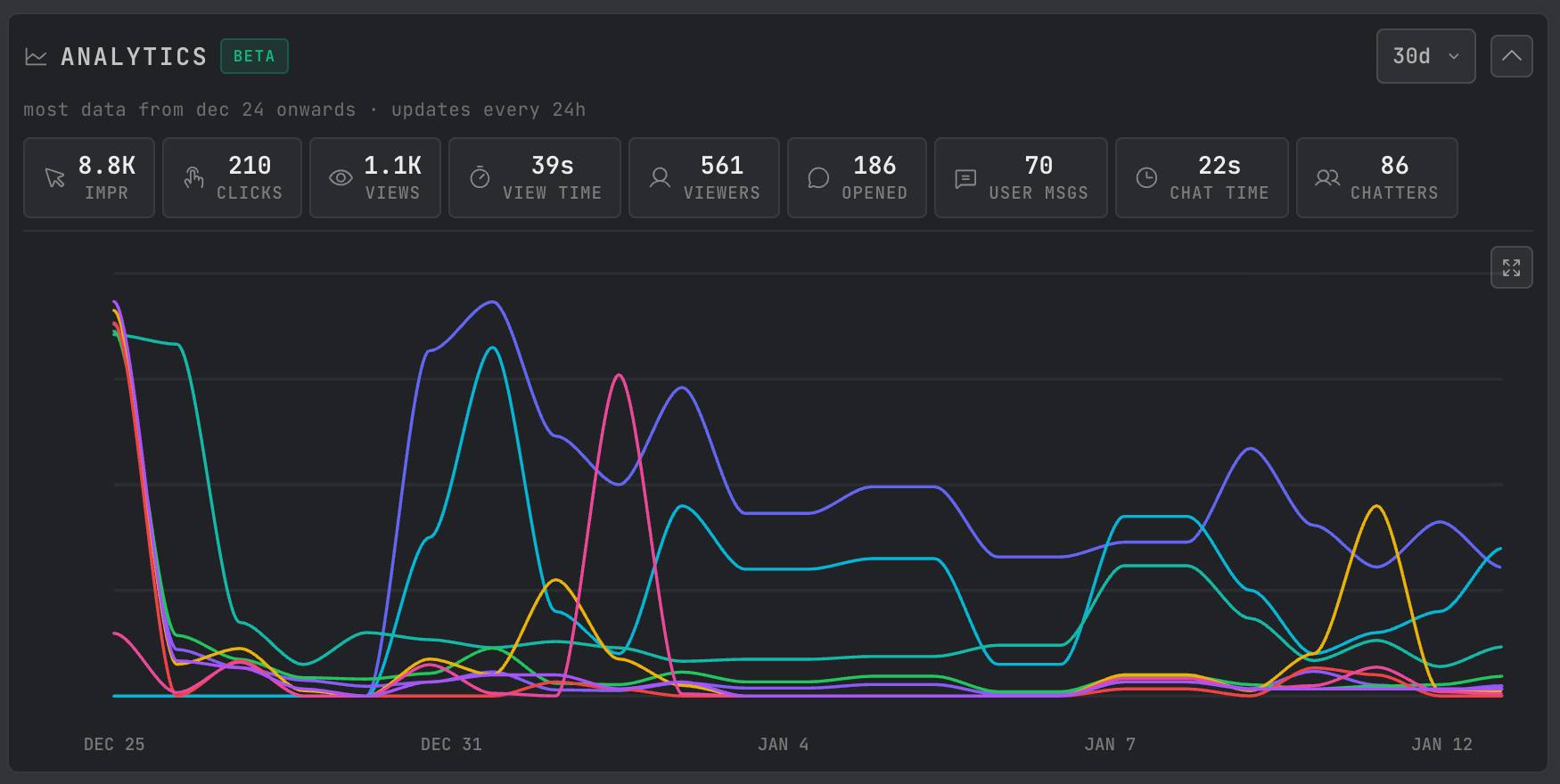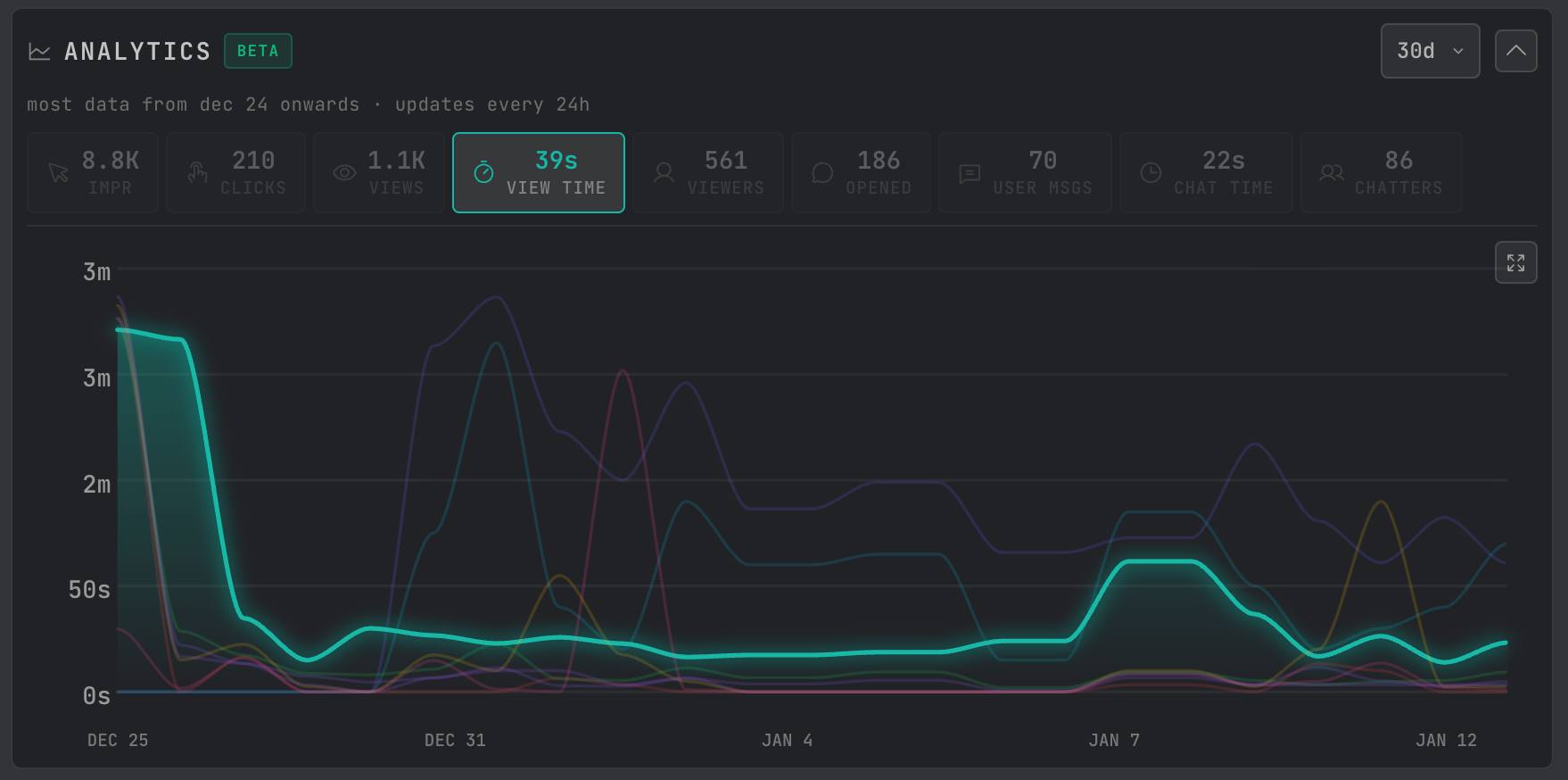 — показатели: показы — сколько раз ваш бот появлялся в лентах/поиске клики — сколько человек перешли по ссылке на твоего бота из ленты просмотров — количество просмотров страницы время просмотра — среднее время, проведённое на странице вашего персонажа зрители — количество уникальных зрителей в день количество введенных чатов — сколько раз вводились чаты с вашим ботом (новые и возвращающиеся) количество сообщений — общее количество сообщений, отправленных вашему боту время в чате — средняя продолжительность сеанса чата чаты — уникальные ежедневные чаты