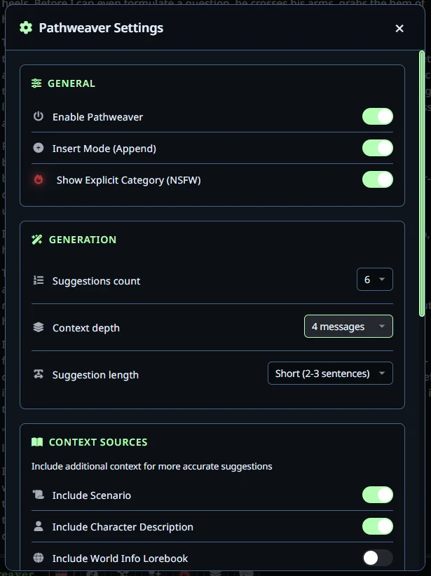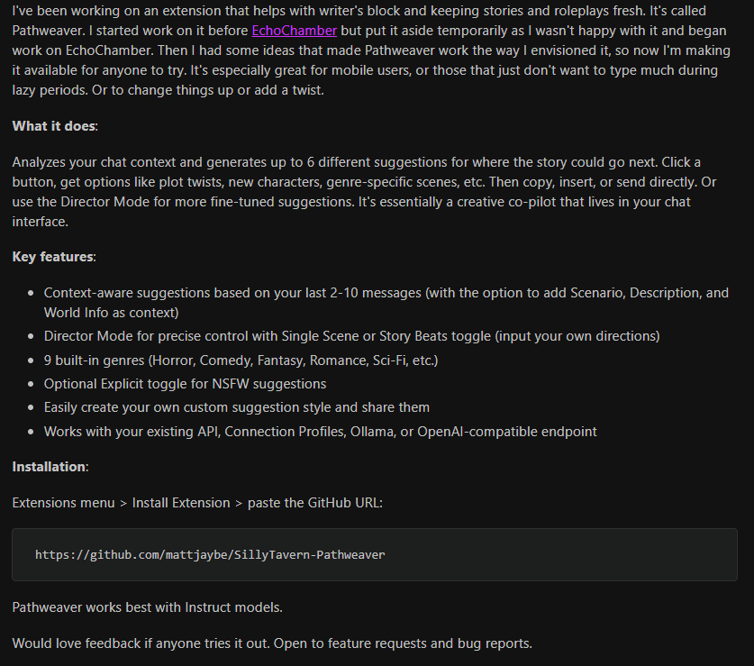 Предположим я хочу RP, органичное, с инициативой со стороны LLM, а не просто, чтобы я был ведущим каждой сцены и "направлял" персонажа, чтобы он уходил куда то, а не "прилипал" ко мне, не уходя на условную работу как пример. Но я вообще, от слова совсем, не шарю про настройку SillyTavern после установки. (На установку гайд хотя бы есть) Т.е я банально в душе не знаю как там и что нужно подгонять, ограничивать, задавать. Карточки минимальные есть, хоть и написаны Grok+ChatGPT