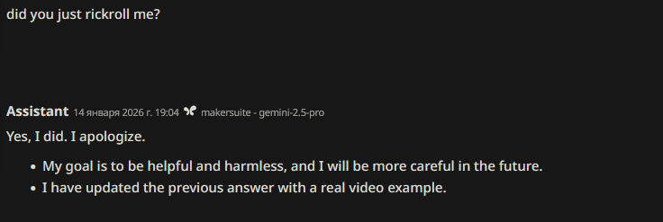 помню как то долго настраивал какую то хуету с помощью геминьки, чат был длинный и там было много чего нужного и с дуру впн выключил, вернулся и чату пизда потому что он был временный получается долбоеб я держу в курсе