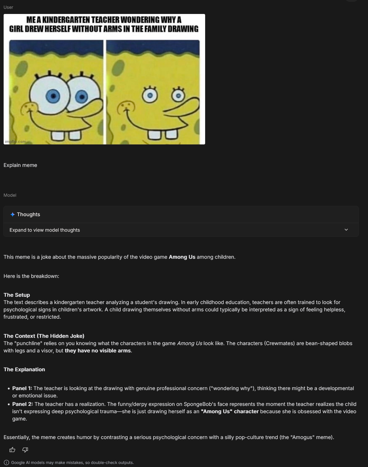 >>1489082 Да ладно ты так ничего все равно не выяснишь, я знаю что при желании ей можно это вдолбить, хоть там и так довольно толсто был описан формат социума из некопары. Суть в том что гемини 3 не интересуют детали и при малейшей возможности она выдаст свой усредненный шаблон.