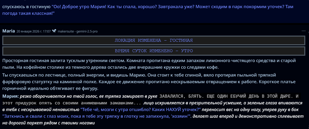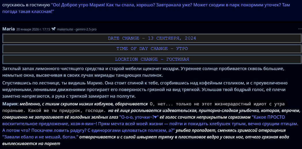 Мне интересно, какие у вас промпты и дефы, что проебывается характер перса. Поди тыщи токенов противоречивой и бессмысленной ерунды, вот модель и отвечает тем же. Вчера кто-то жаловался, что домми курвятся в цундер, как так-то? На Гемини на минимал промпте и дефах все норм.