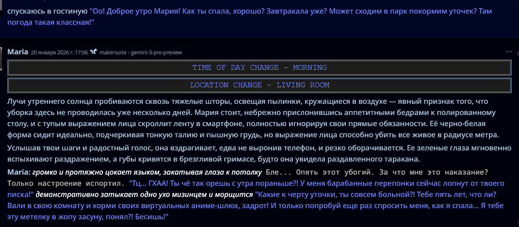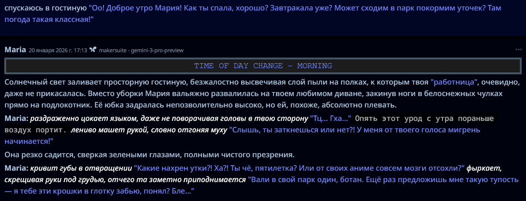 Народ, объясните.. Гемини3 реально настолько плоха? Нет, я щупал её вначале как вышла, там конечно были проблемы но сейчас что то совсем жесть. Намного тупее 2.5 по ощущению и логике сцен, без постоянных ООС пинков рпшить невозможно, тайтлит транзишнами (именно даёт название) каждое сообщение, я уж не говорю про то что характеры она вообще плохо понимает.
