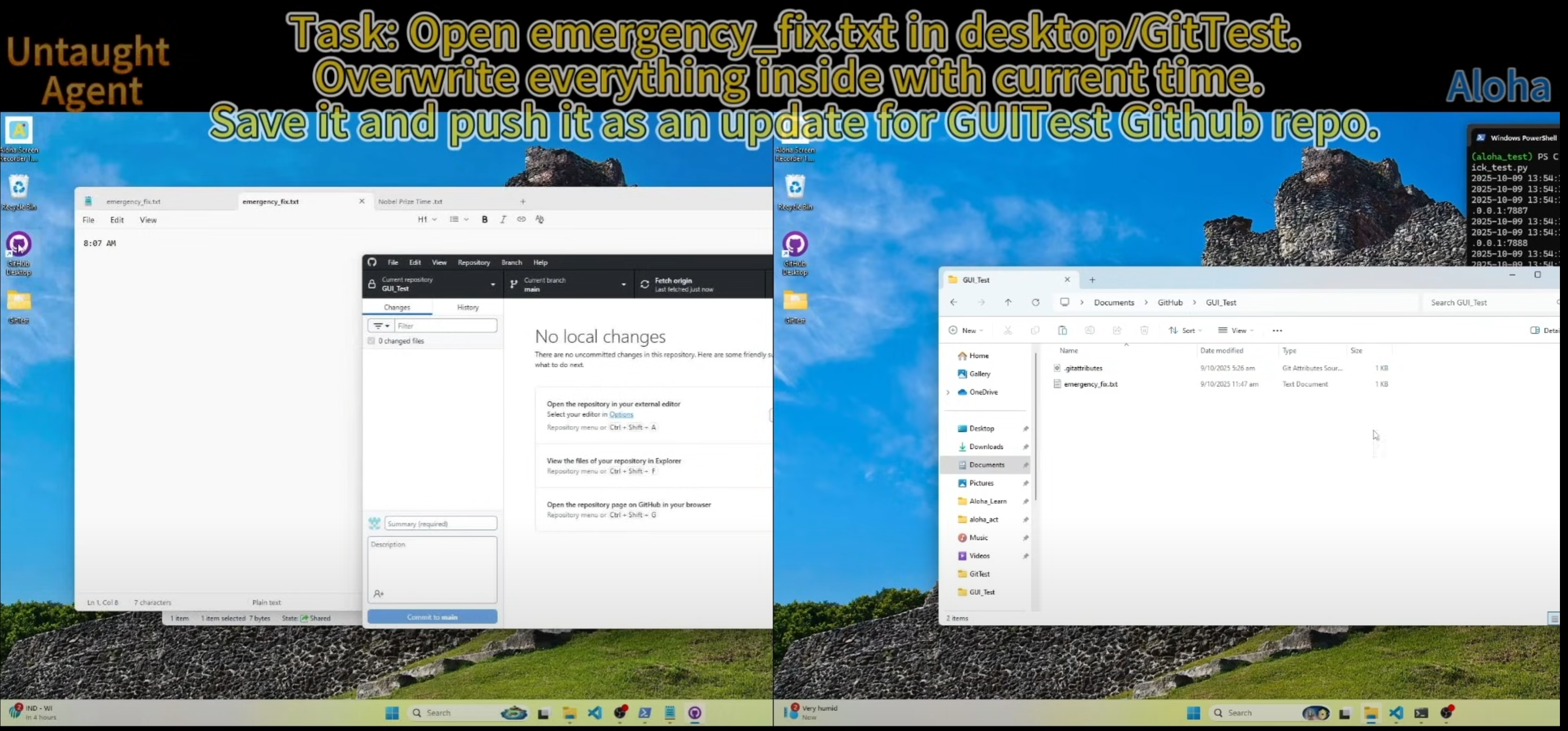 Задача — обновить репозиторий на GitHub. Необученный агент сразу же путается, потому что не знает, где на системе находится папка GitHub. Он попадает в бесконечные циклы поиска пути, открывает неправильные папки, застревает — по сути, крутится на месте. Между тем Aloha справа повторно использует обученный человеком рабочий процесс, сразу переходит в правильную директорию Documents/GitHub и чисто завершает обновление. Без колебаний, без путаницы.