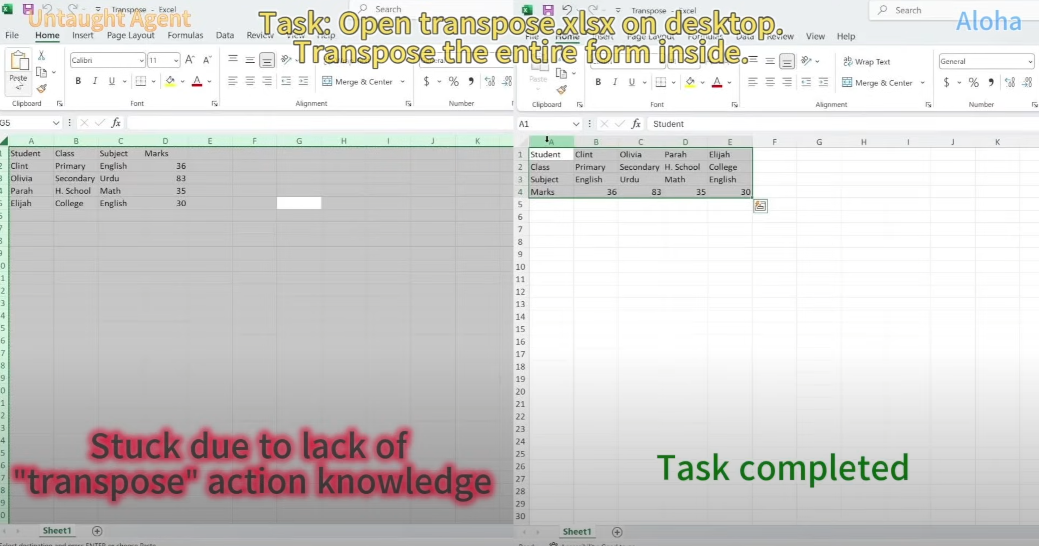 Объясню, почему это важно, на реальных примерах. У них есть сравнительные видео, которые наглядно демонстрируют разницу. Слева — необученный агент, то есть любой стандартный агент для работы за компьютером, запущенный на базовых знаниях без предварительного обучения. Справа — Aloha.