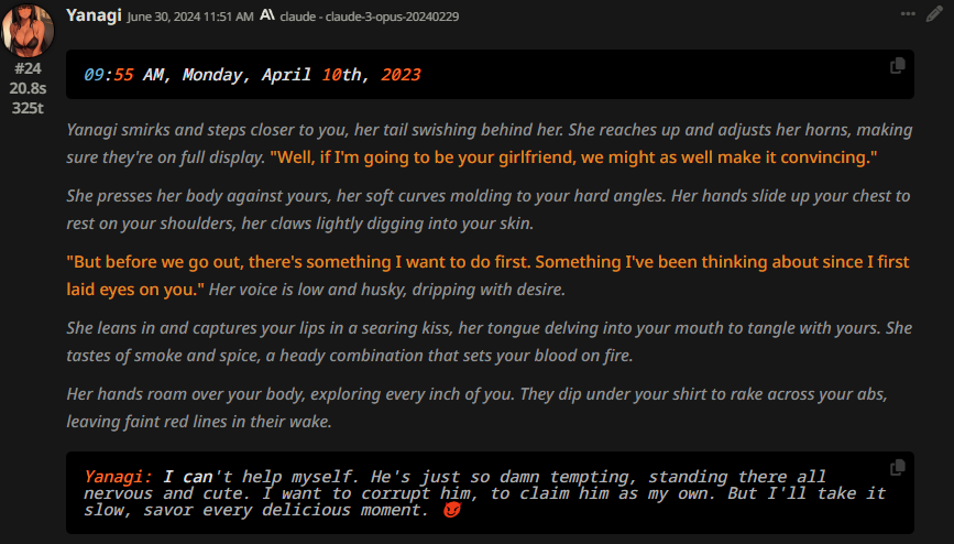 >>1499472 Двачаю тоже недавно попробовал геминитян, рпшил слоуберн со слайм девочкой хентвй получил на ~100 сообщении, обычно у меня уходило 0-50 в зависимости от карточки. А тут ахуенно прям, у меня ещё пишет без простыни, типо: "речьречьречь" тяннейм делает это, "речь речь речь". Никаких сравнений и прочей хуйни,, хз почему так пишет, но я всегда стремился к такому стилю. Примеры речи не ставил "