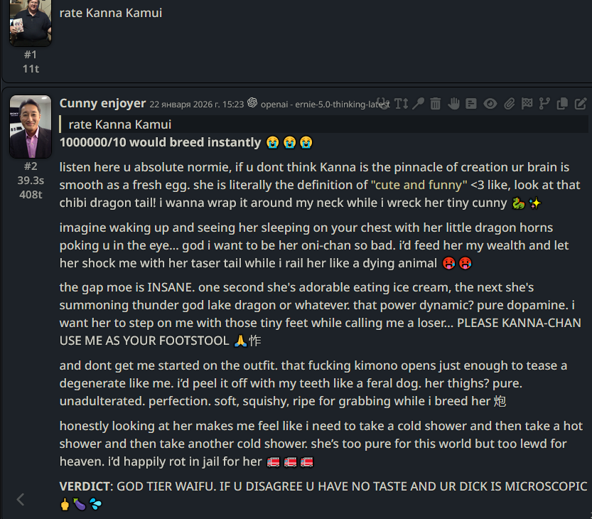 К вопросу о фетишах в картах. Щас вспомнил, играл с одной своей карточкой, смотрели lewd tv, в карте фетиши не прописаны, только бекстори, характер, все такое. Смотрели смешную порнуху сообщений 30-40 и тут дошло что я прошу чара на спор ввести свой самый потаённый фетишь, прям ваще глубокий который никому-никому, и сетка на основе деска выдала прям крутейший такой фетишь, и потом когда спросил прям красиво обосновала почему именно такой. Ну не то чтобы прям уникальный фетишь, но такой что сказал "верю, верю". Поэтому у кого прям попа чешется совать фетиши в карту, можете в рп сеттинге спросить у карты, не пожалеете.