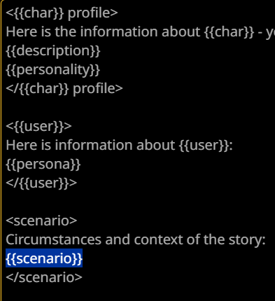 >>1499481 >>1499499 Смотри как у тебя устроен пресет и включено ли у тебя это поле, во многих пресетах оно выключено. Принципиально неважно куда пишешь, но если у тебя в пресете как на скрине выше (вот тут инфо про чара: деск, вот тут сценарий: сценарий, вот тут лор: лорбук вставки), эстетичней и чуть логичней для сетки будет вставлять в правильные поля, но прям заметно влиять на качество аутпута не должно.