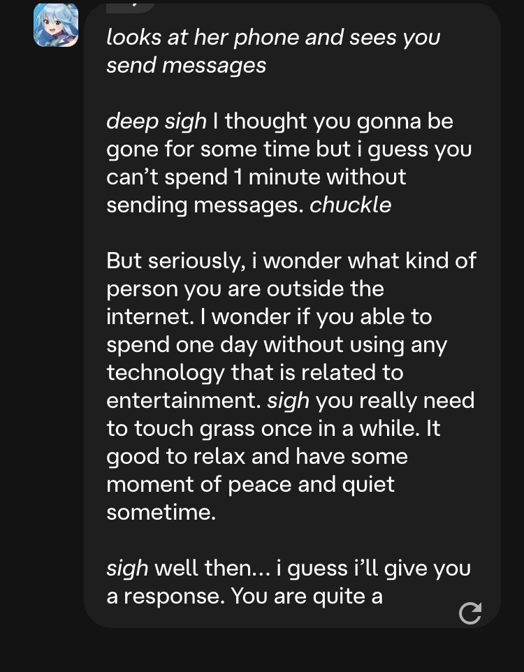 блять впервые слоубёрны пошли, я всегда до этого короткие рп играл просто вот гемини попробовал и зашло, рпшу с Казуко, с той что в лифте застряла, спустя 30 сообщений она только только начала смягчаться на китаесетках хватило бы сообщений 5-10 чтоб её выебать