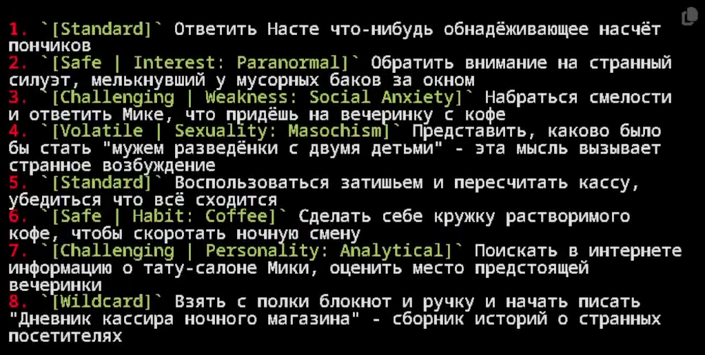 >>1500534 У меня godmode, я ебал с кубиком ебаться, сопли выкидывать на очевидные вещи это хуйня полная Это ленивый пресет. В конце концов, если варианты действий не нравятся, то можно просто отредактировать. Ну или вместо циферки в своем ответе как обычно написать