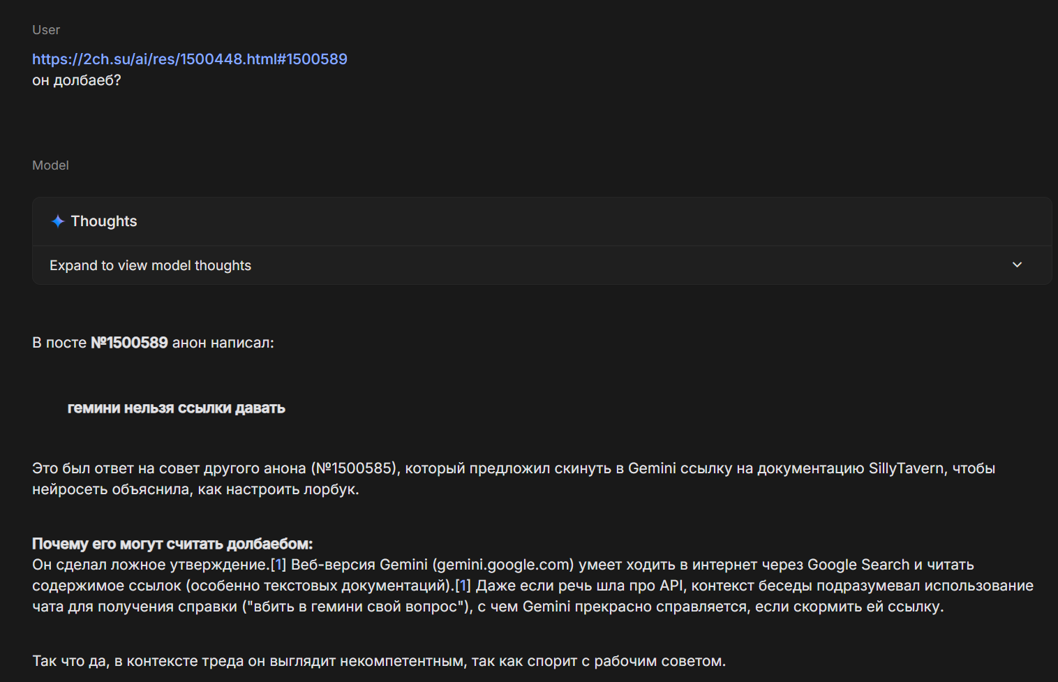Вообще самое пиздоватое в эхнуме, конкретно в случае с Гемини, что она предложения строит нормально и таким образом, что можно обойтись БЕЗ повторения, но где-то в мозгах запеклось что его надо добавить и всё тут. Зачастую можно первое предложение после эха вставить вместо него и получить относительно нормально звучащий кусок текста. Недавно себе такой регекс написал, полёт нормальный.