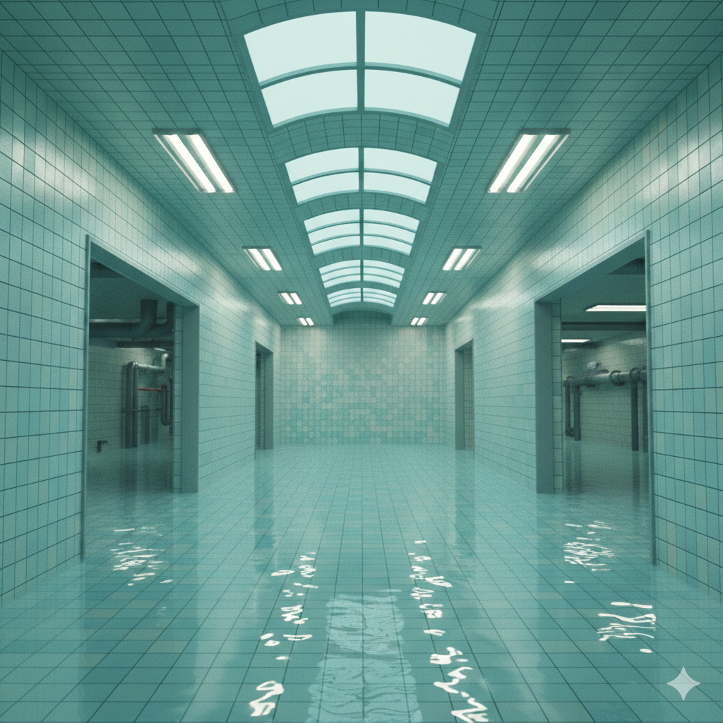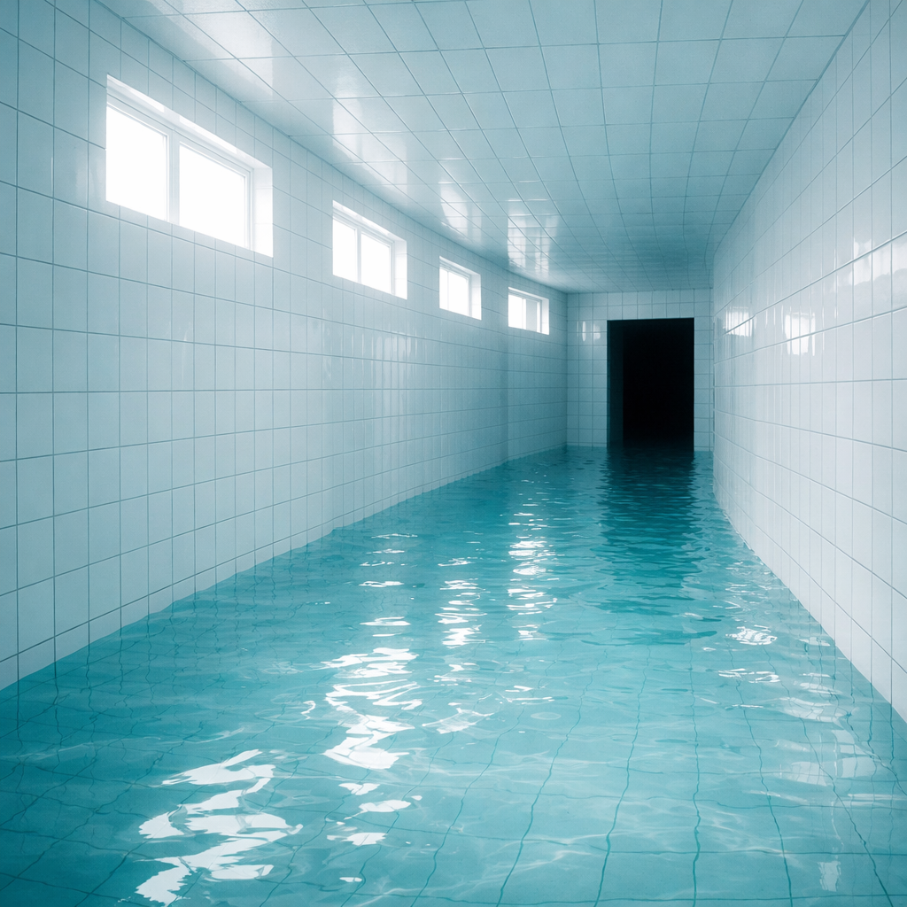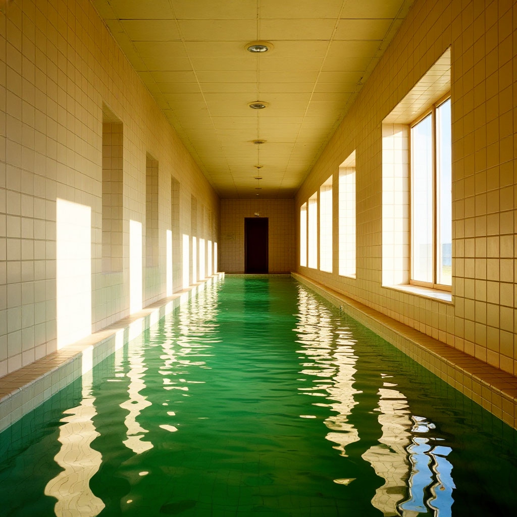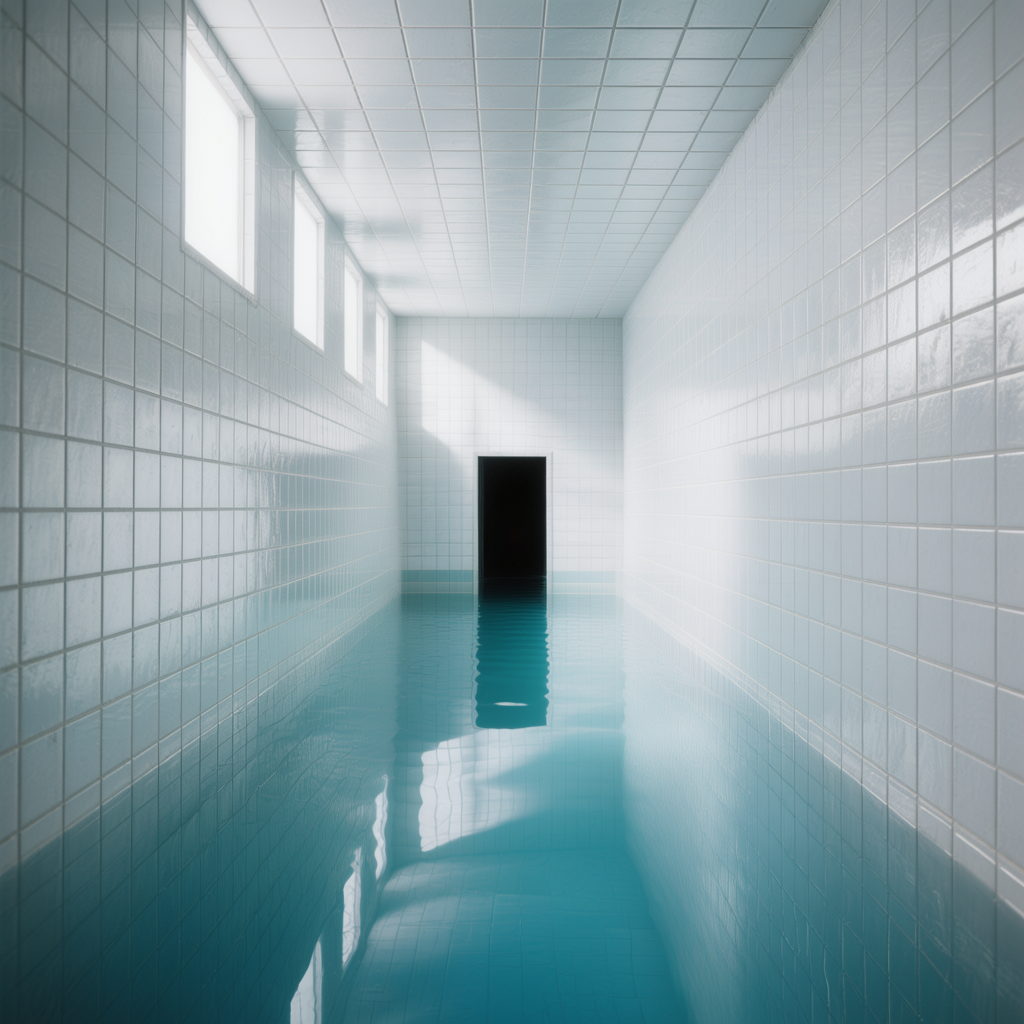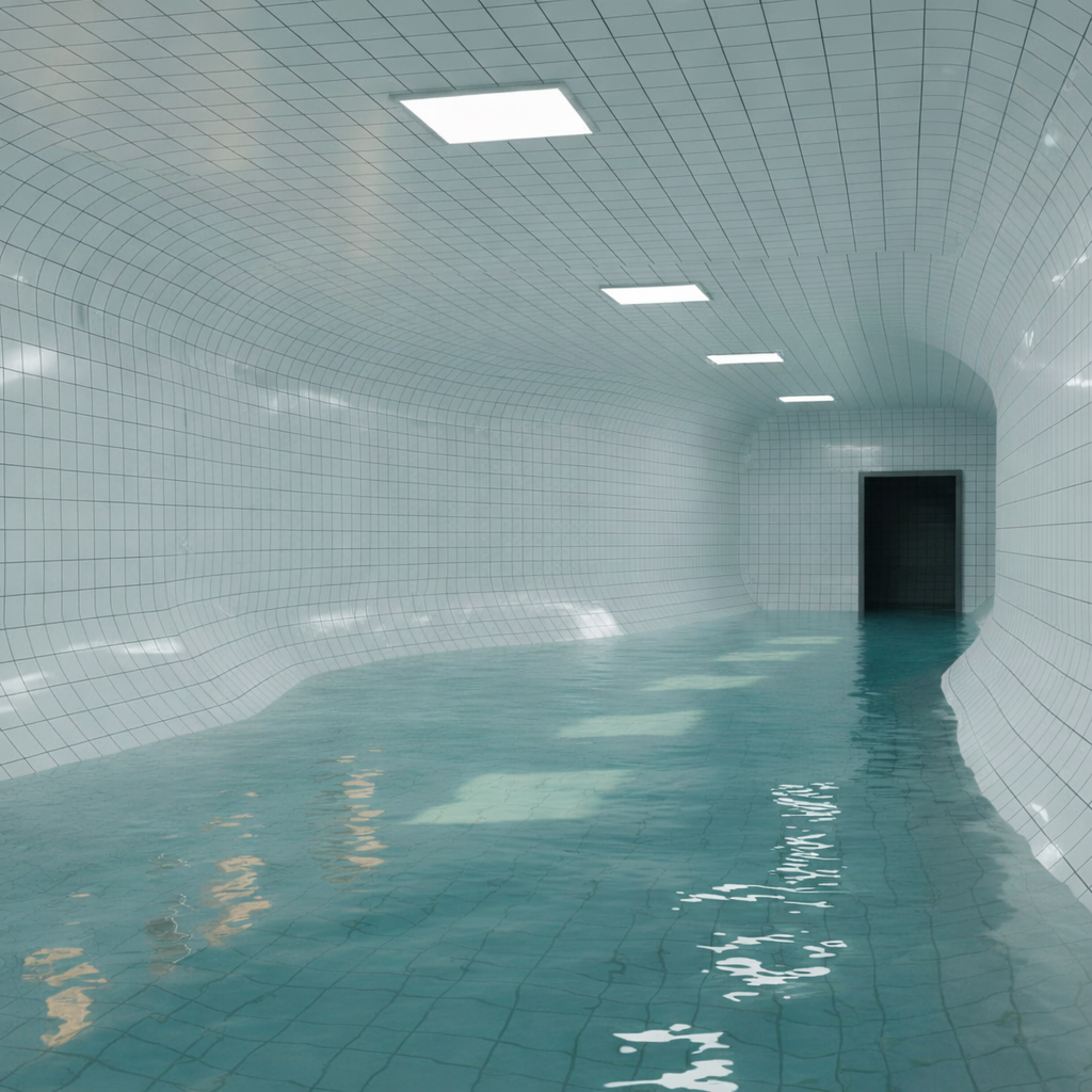 🏊 Пустые или почти пустые помещения 🧱 Повторяющуюся плитку (часто белую или голубую) 💡 Равномерный холодный свет 🌫 Ощущение тишины, изоляции и «вне времени» 🚪 Тёмные проёмы или коридоры, ведущие «в никуда» 💧 Спокойную воду без людей