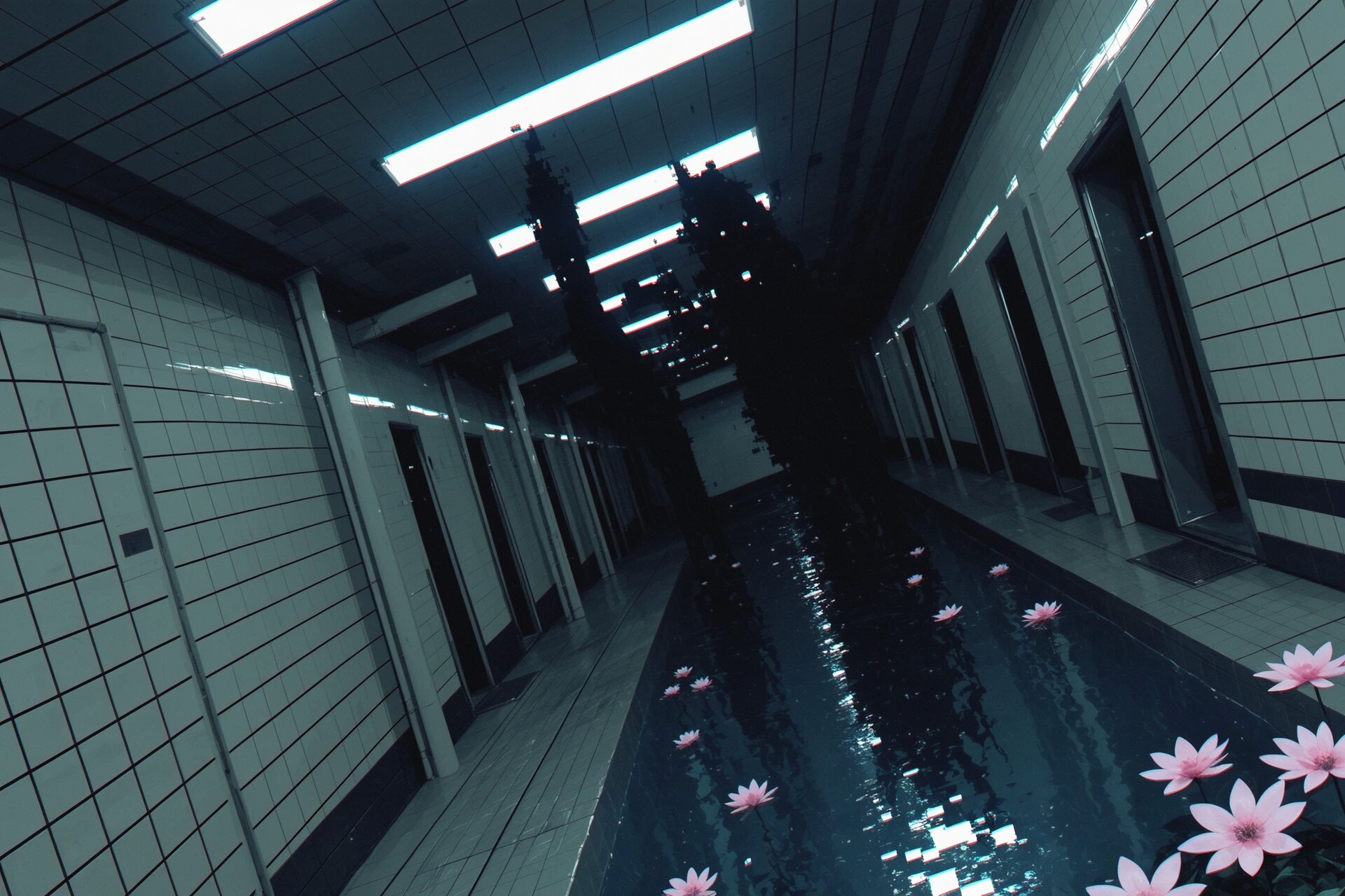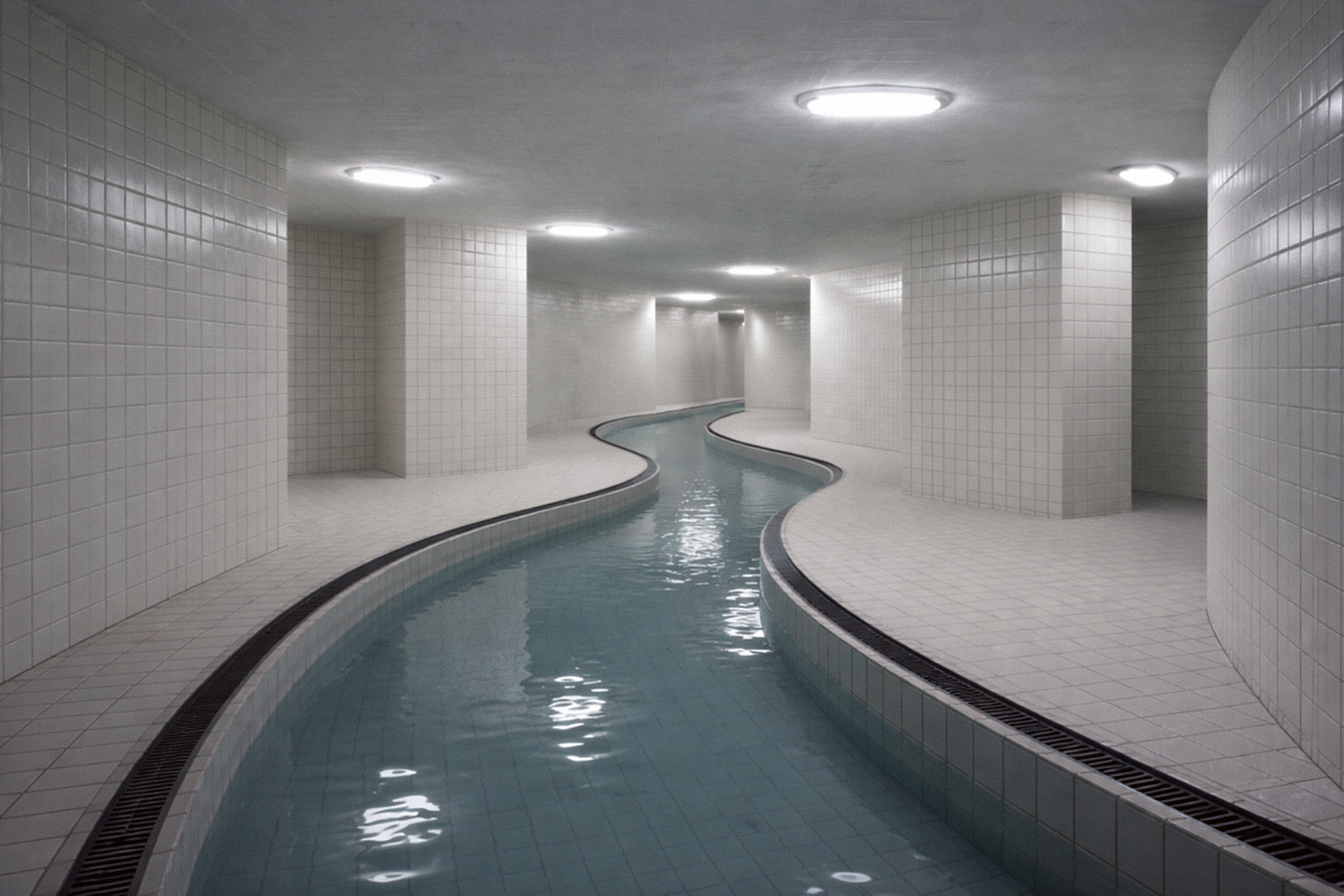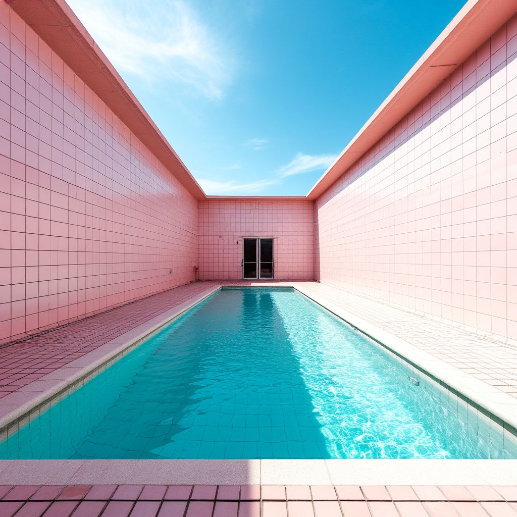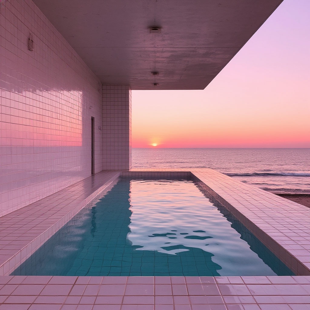 🏊 Пустые или почти пустые помещения 🧱 Повторяющуюся плитку (часто белую или голубую) 💡 Равномерный холодный свет 🌫 Ощущение тишины, изоляции и «вне времени» 🚪 Тёмные проёмы или коридоры, ведущие «в никуда» 💧 Спокойную воду без людей