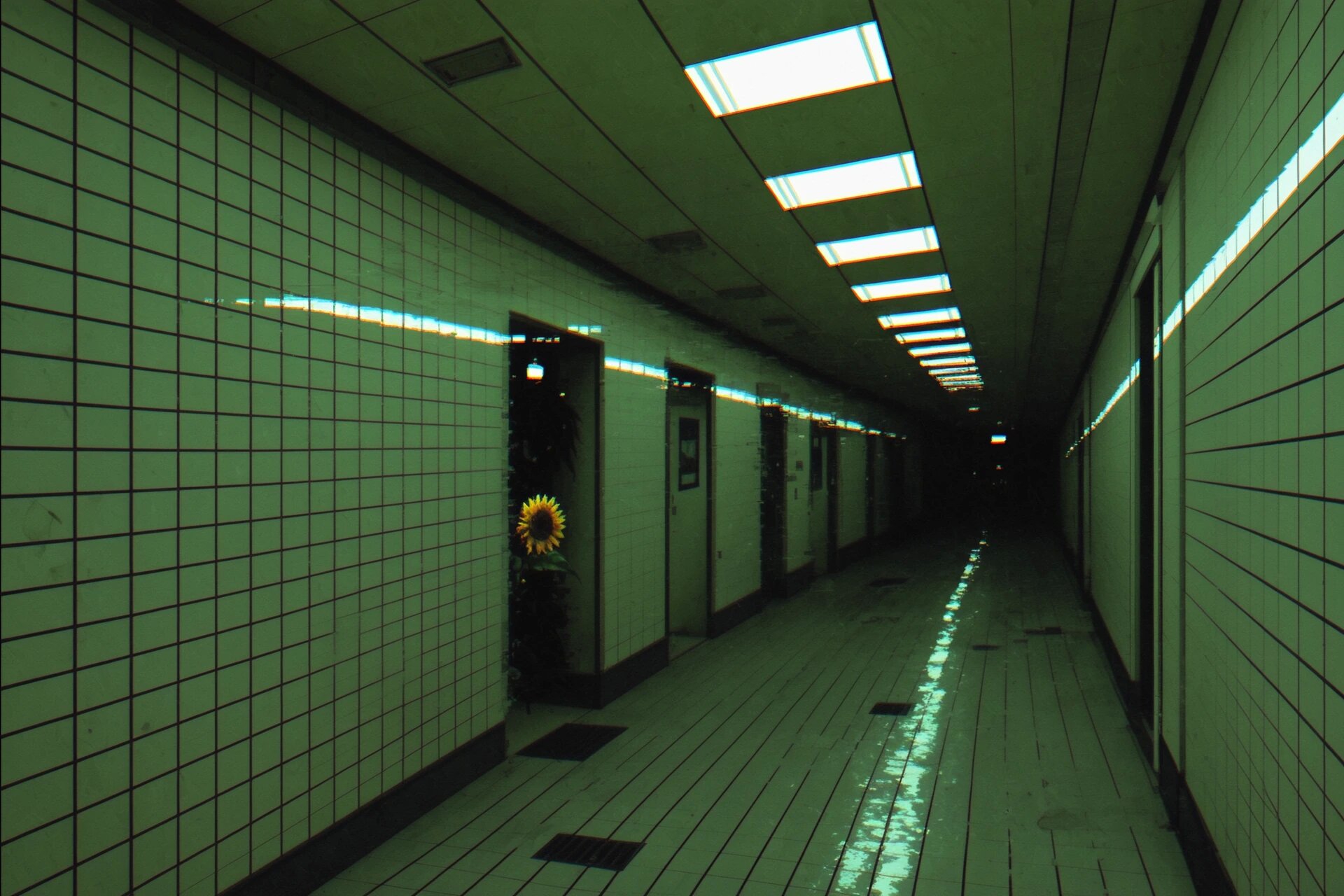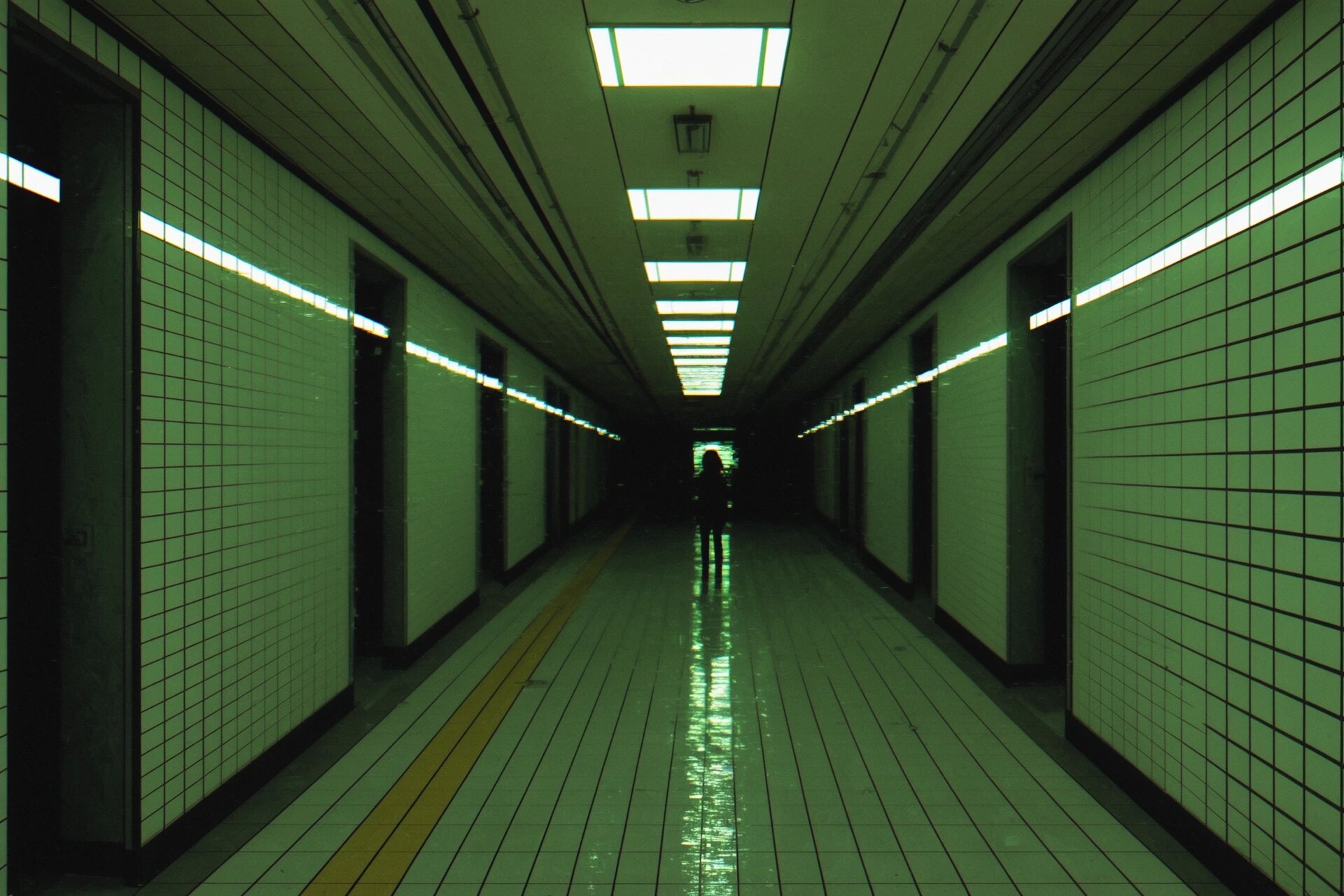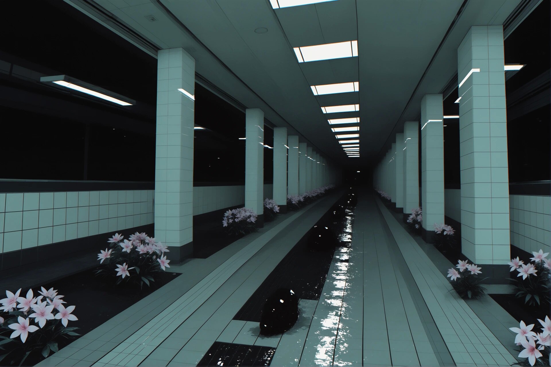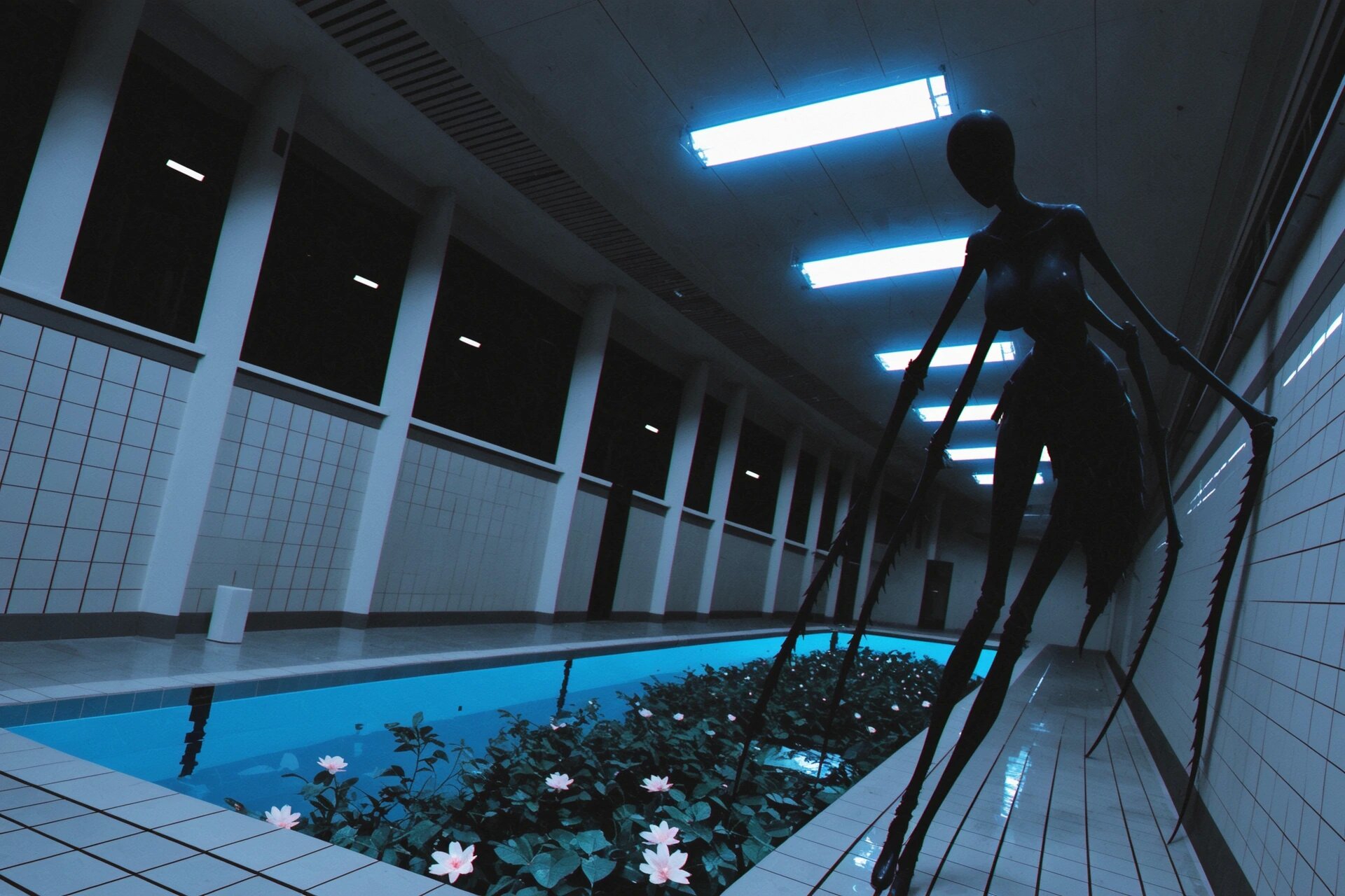 🏊 Пустые или почти пустые помещения 🧱 Повторяющуюся плитку (часто белую или голубую) 💡 Равномерный холодный свет 🌫 Ощущение тишины, изоляции и «вне времени» 🚪 Тёмные проёмы или коридоры, ведущие «в никуда» 💧 Спокойную воду без людей
