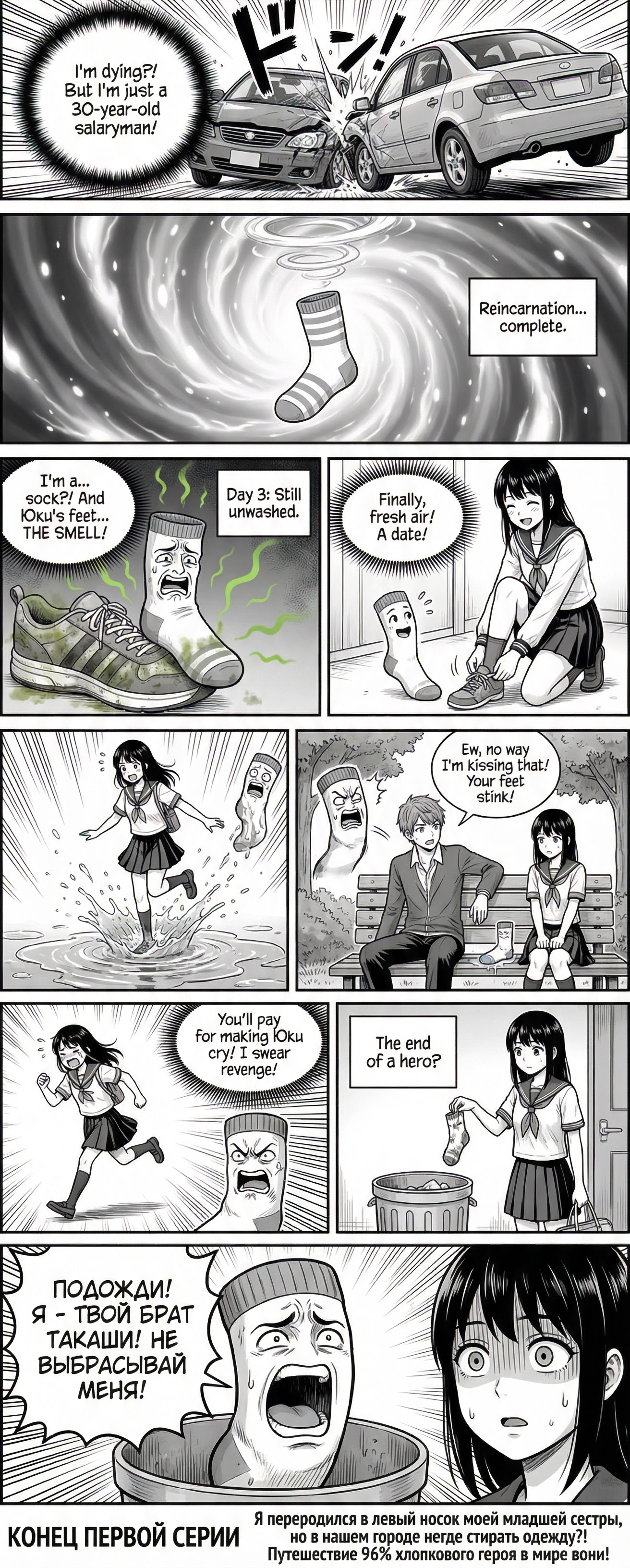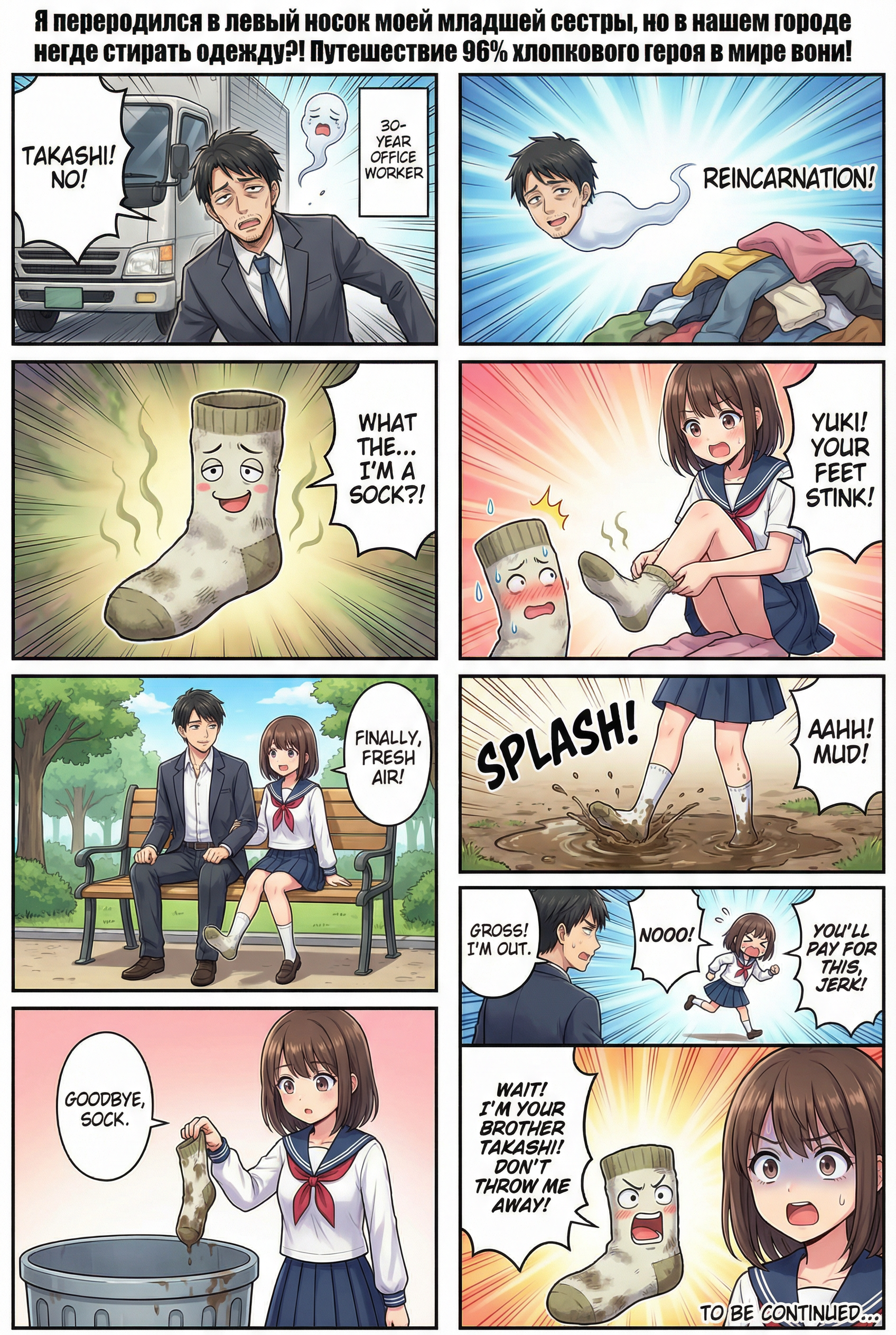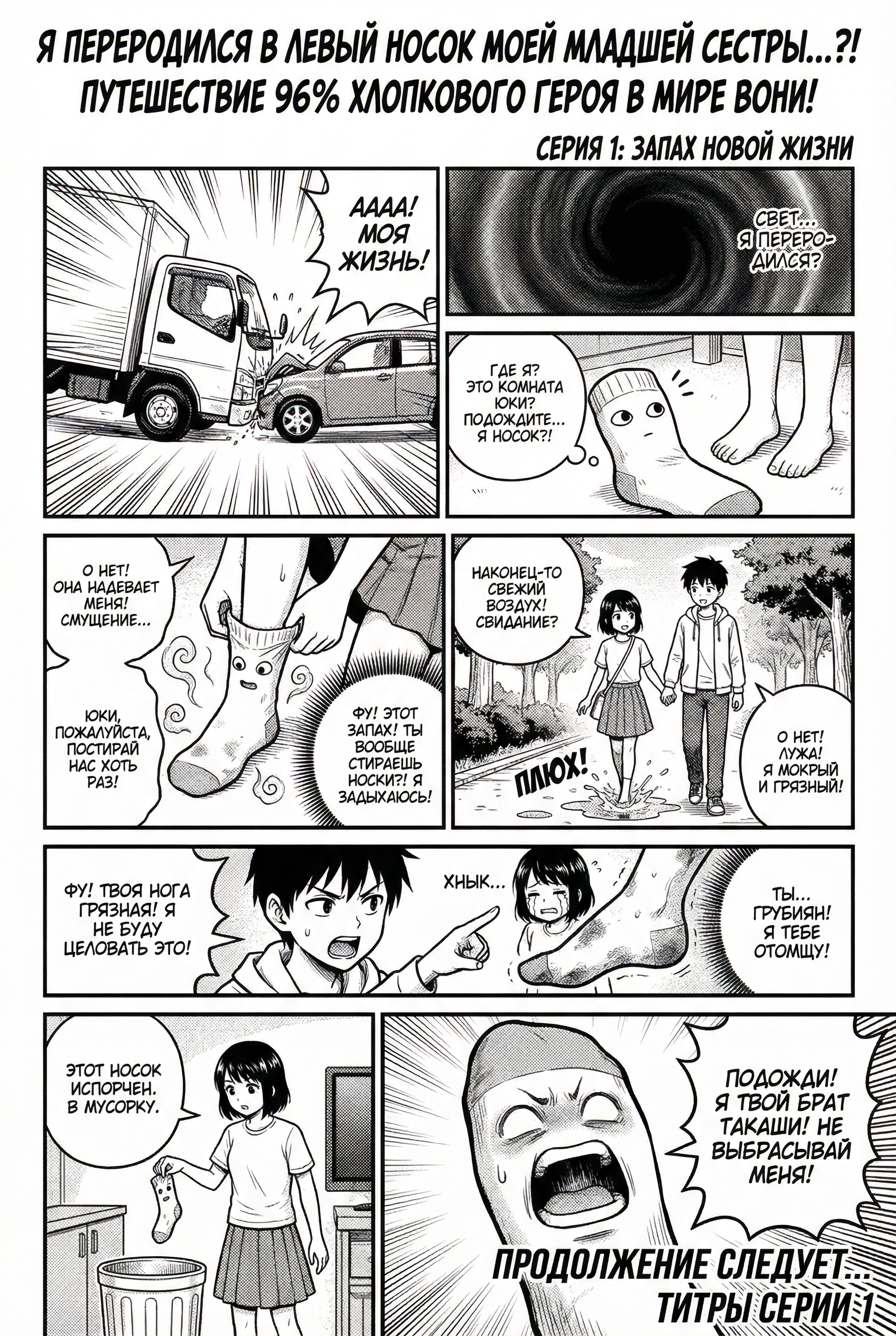 >>1524633 Мнемозина Сгенерируй вертикальную манга-страницу по следующему сюжету: [[ Добро пожаловать в первую серию аниме "Я переродился в левый носок моей младшей сестры, но в нашем городе негде стирать одежду?! Путешествие 96% хлопкового героя в мире вони!".
