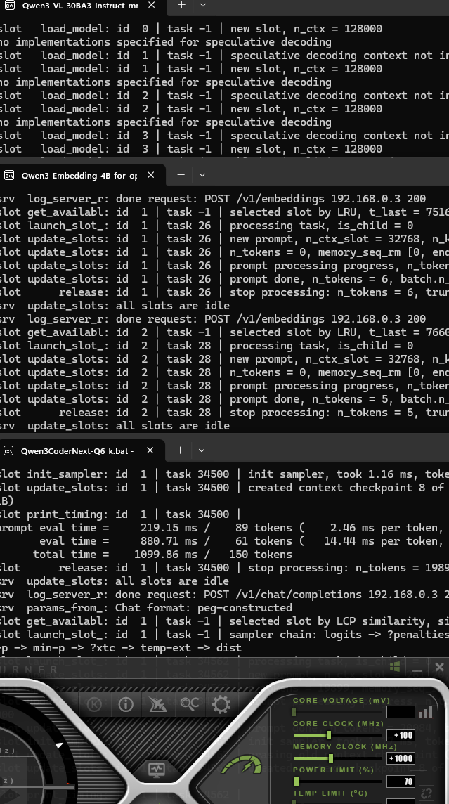 >>1529560 > vl но с таким крупным контекстом Для вижна - картинки "смотреть", что кидаю ей. Контекста дофига, да - можно поджать. Редко её дёргает. Эмбединги для векторной памяти, чтобы сохраняла свои дела за день, и потом можно было искать. А основная квен-кодер-некст-80 - лучший баланс для локального использования по консенсусу: достаточно новая, хорошо понимает вызовы тулзов и как ими пользоваться, влезает в фуллврам. Тот же квен235 - вроде умнее, а в тулзах путается. Можно еще гпт-осс-120 примерно также использовать +- одинаково. Ну и очевидно, что это всё равно не сравнимо с корпами. Но с другой стороны - вот так она уже работает: может сама себя править, делать мелкие делишки, чятиться в телеге.