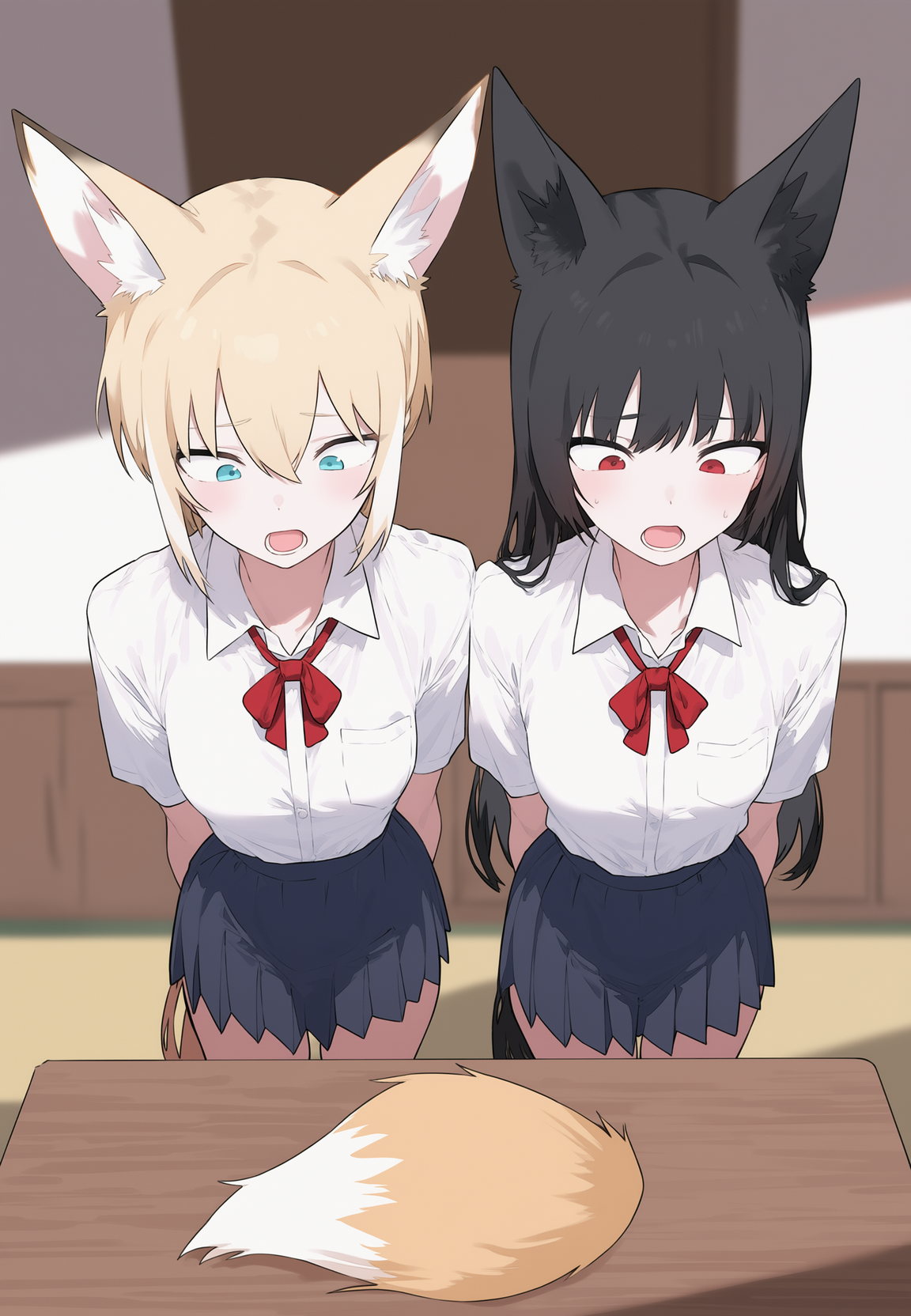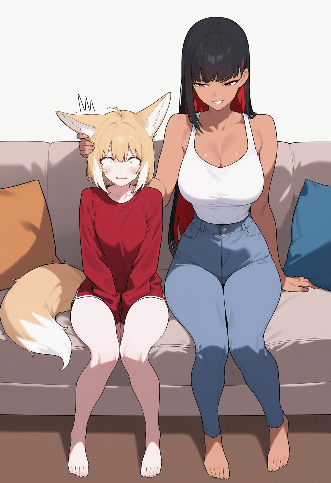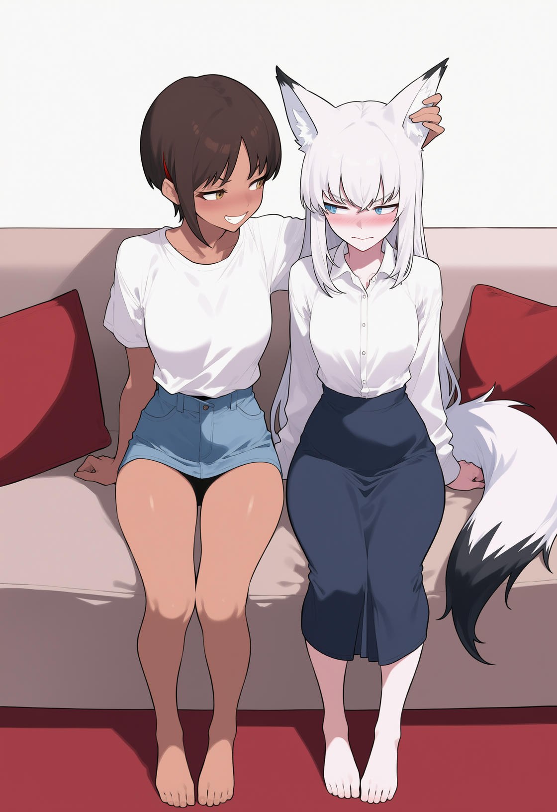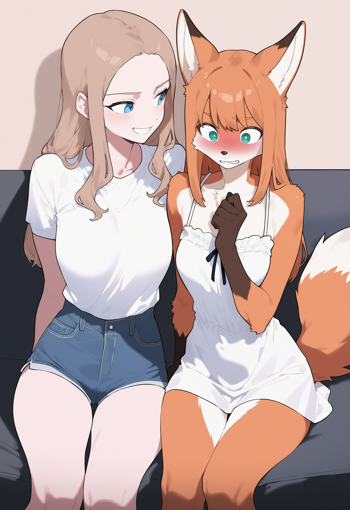 masterpiece, best quality, anime, keihh style, 2girls, full body, sitting on couch, human girl hugging furry fox girl, fox ears, fox tail, foxgirl, anthropomorphic fox, intimate embrace, one arm around waist, heads close together, human girl with long brown hair, blue eyes, wearing casual t-shirt and shorts, fox girl with orange fur, white chest fur, green eyes, fluffy tail curled around, wearing crop top and thigh-highs, relaxed pose, slight blush, simple living room background with couch.