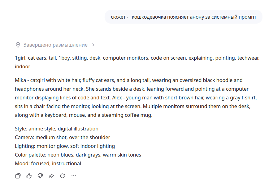 >>1532813 Я другой анон, лично я сначала у квена и дипсика прошу создать системный промпт по определенным правилам, промпт сохраняю в файл и потом уже прикладываю его как аттач и использую для генерации промптов.