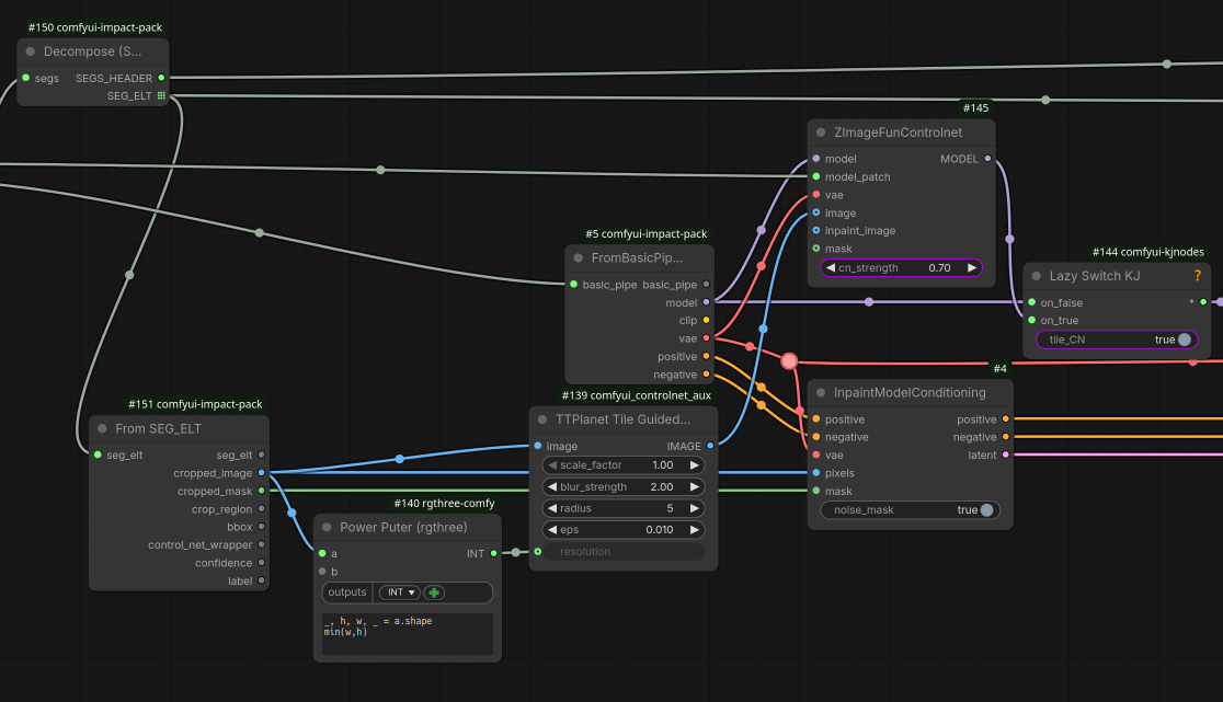 Бля. Кое-как запердолил тайловый апскейл с контролнетом (3) на ZIT, но всё равно рулетка. Даже с высоким strength хуй чего удерживается с их вариантом tile контролнета, но лучше, чем ничего. Автор USDU нихуя не спешит чинить тайлинг кондишена через model_patcher.