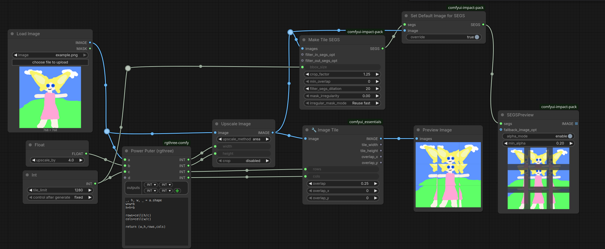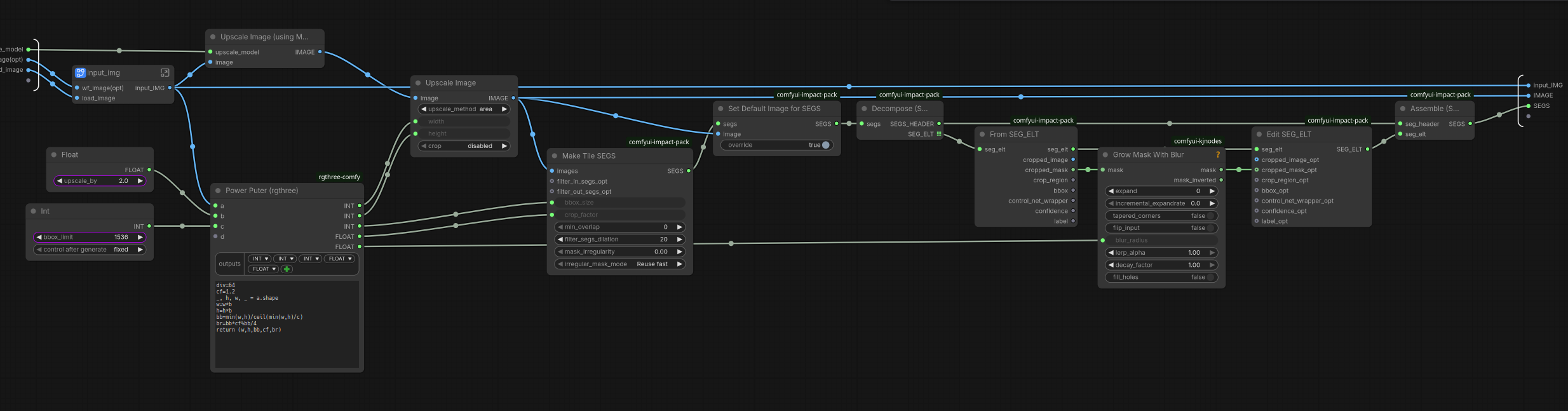 >>1528171 Ну как бы там >>1528139 так же делается, только на тайлы картинка бьется не вручную, а Make Tile SEGS из импакта (пикрелейтед). Единственный косяк - тайлы только квадратные. Есть еще 🔧 Image Tile от матео - охуенный контроль размера тайлов, но там нет возможности выдать маску, так что не катит. Пробовал еще какую-то ноду, выдает и тайлы, и маски, но там код кривой, на не крайних тайлах оверлап добавляется справа и снизу, а не со всех сторон - выкинул это говно. Ебашить вручную - это пиздец, без возможности динамически менять количество и размер тайлов в зависимости от инпута.