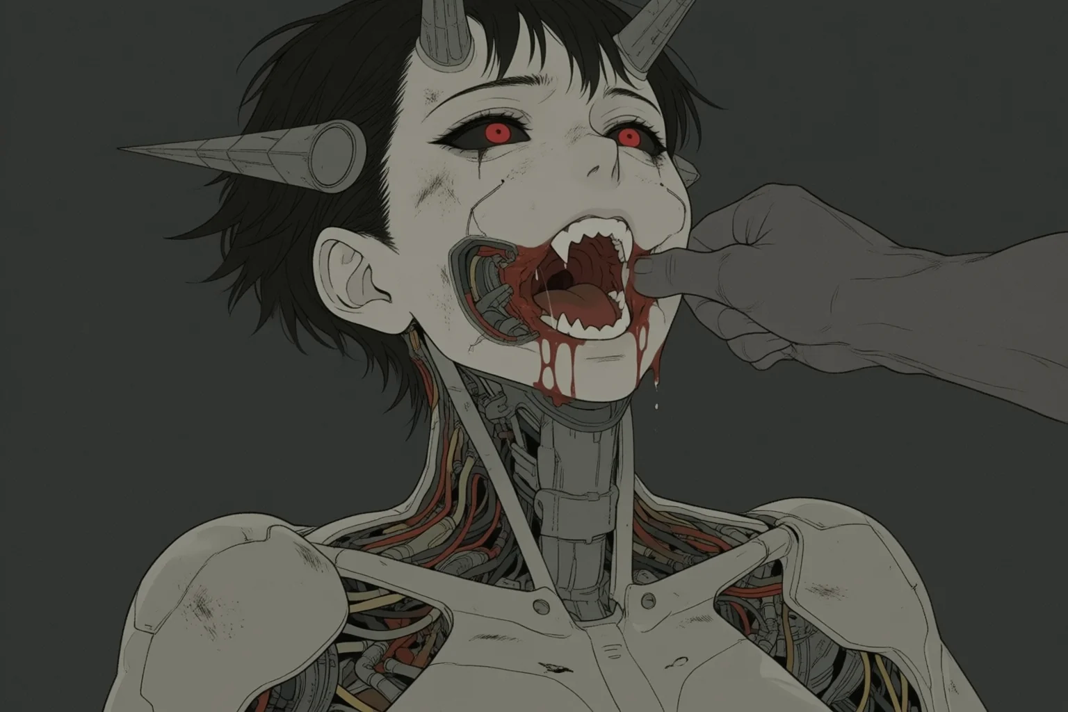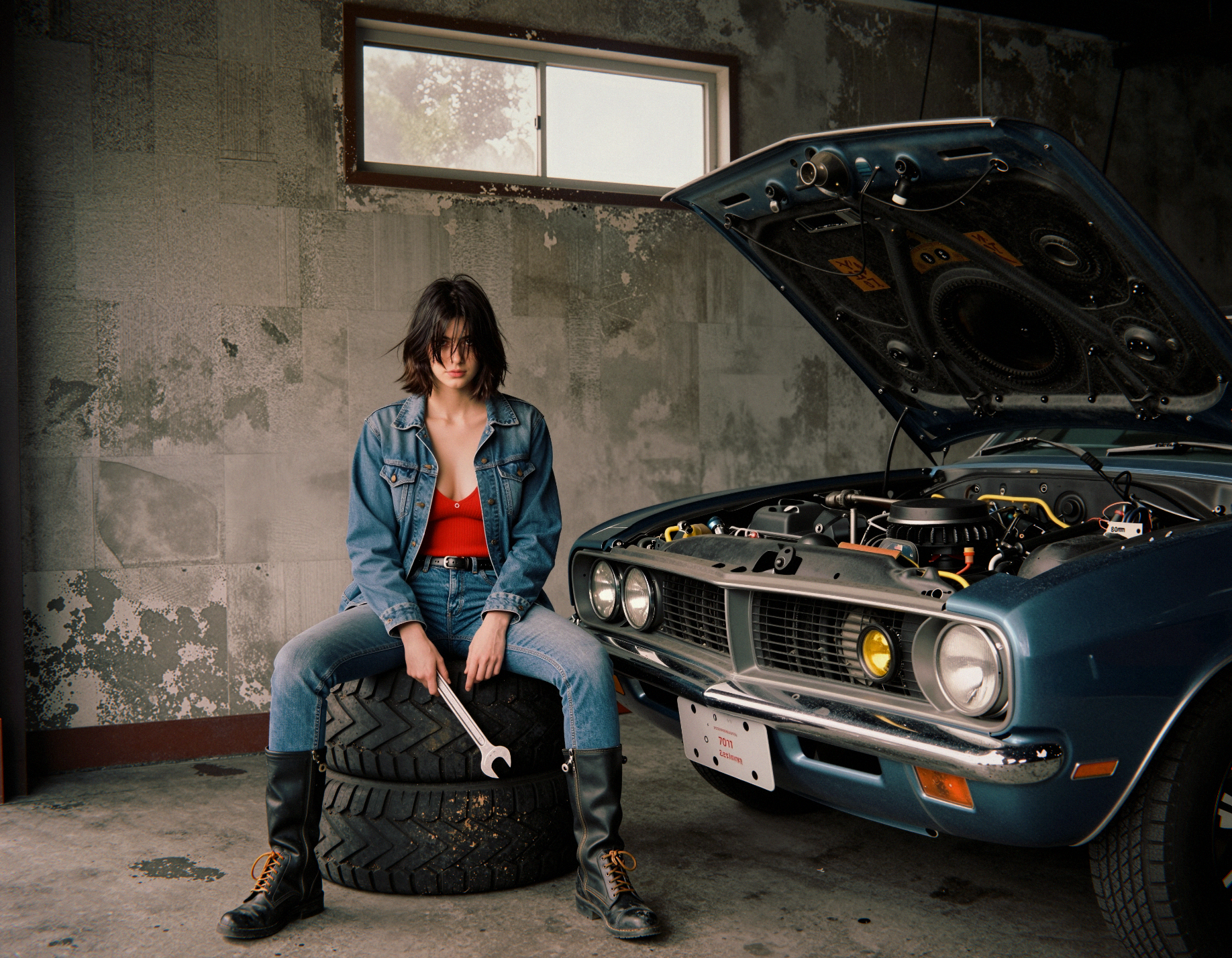 >>1533540 Ultra-detailed erotic portrait of a wild, untamed young woman in her early 20s, raw feral beauty radiating dangerous allure. She stands defiantly in a decaying industrial wasteland hideout, piercing direct gaze locked on the viewer — eyes heavy with lust, challenge and quiet desperation, slightly parted lips glistening as if she just licked them, subtle flush on cheeks and chest.