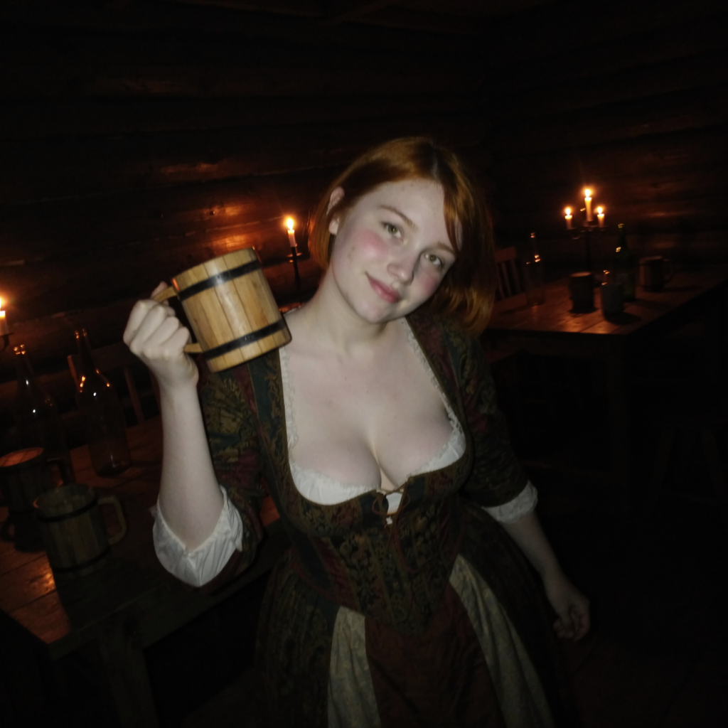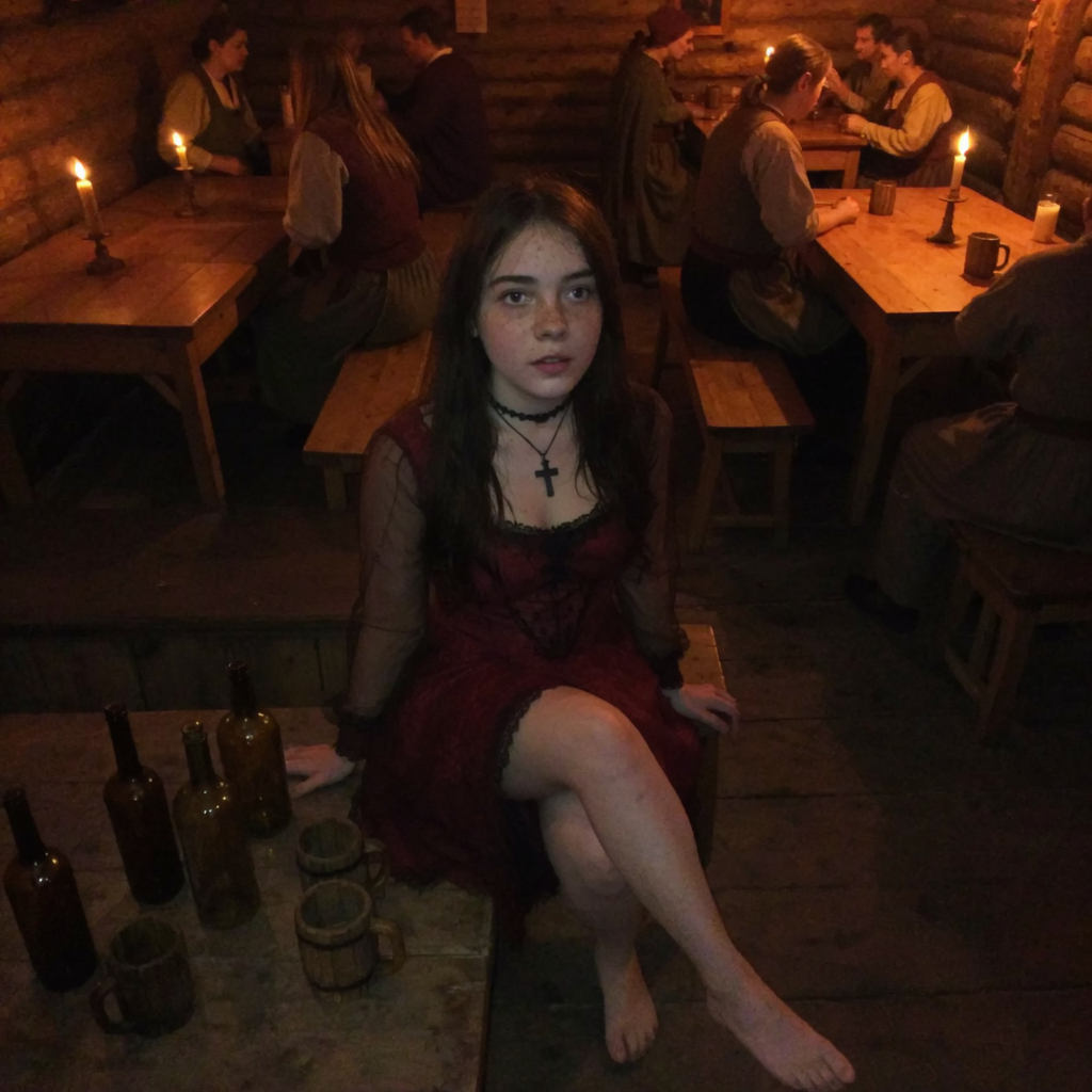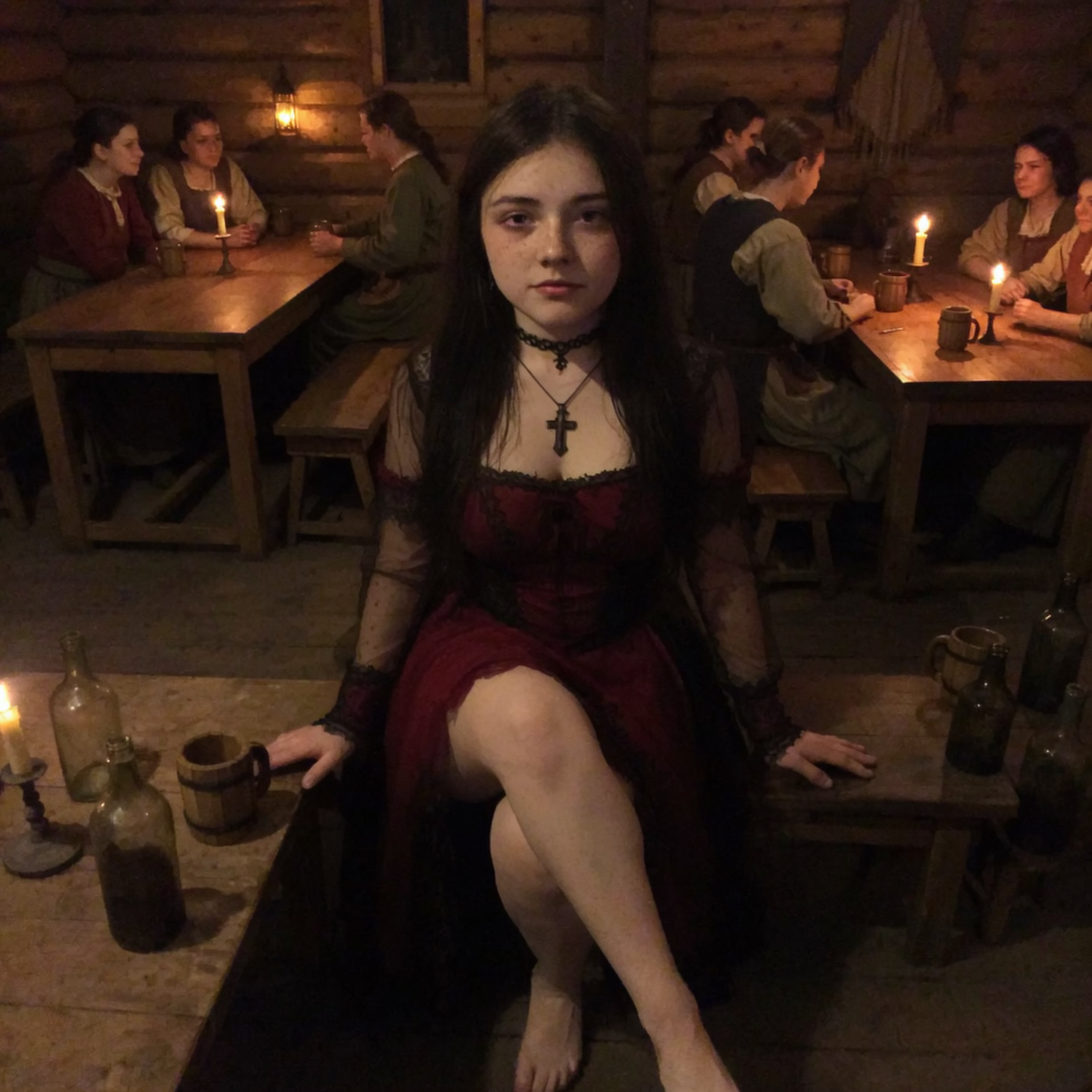 In her left hand a rough wooden staff, held low and casually, tip resting on the filthy floor, her grip firm yet sensual — like she could use it to pin someone down or balance while riding.