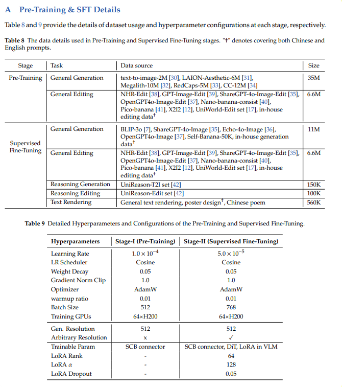 >To fully unlock the potential of of DeepGen 1.0’s compact architecture, we design a data-centric training strategy tailored for tight VLM-DiT integration in the low-parameter regime. This strategy emphasizes simplicity and data efficiency across three progressively stages. First, in Alignment Pre-training, we optimize only the connector and learnable think tokens to align VLM representations with the DiT’s latent space, utilizing large-scale image-text pairs and editing triplets. Second, during Joint Supervised Fine-tuning (SFT), we unfreeze the DiT and apply LoRA to the VLM for end-to-end optimization.
