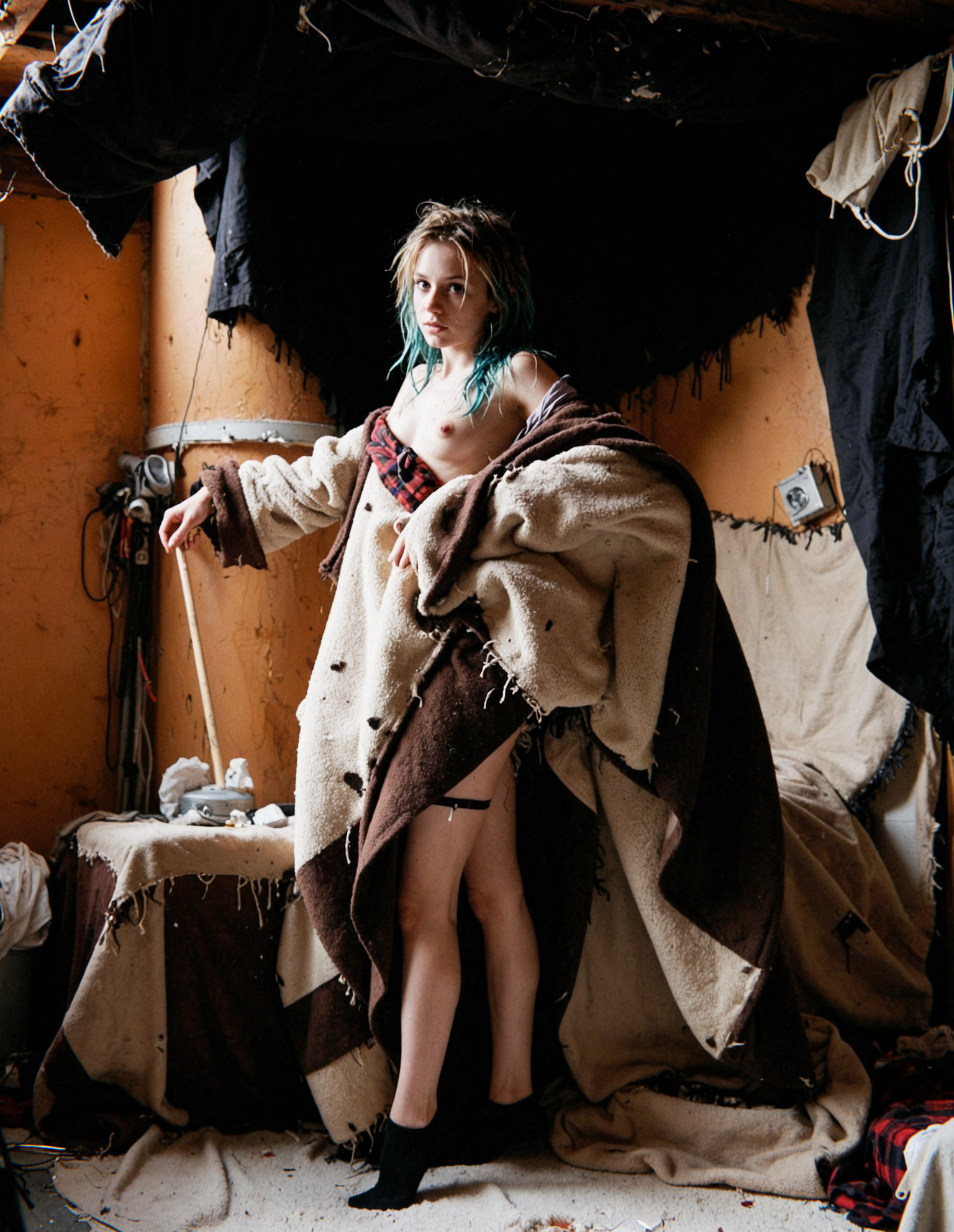 Draped loosely over her shoulders and back is a massive, filthy, oversized patchwork blanket-coat — layers of ragged beige fleece, scorched brown wool, frayed tartan scraps, torn black cloth — it hangs open at the front, framing her naked torso like a ruined robe. One side has completely fallen off her shoulder, pooling at her elbow, the other clutched loosely in her right hand near her thigh, fingers teasing the edge as if ready to let it drop entirely. Fabric full of authentic grime, burn holes, loose threads, dried mud, giving it a post-apocalyptic, been-fucked-in-the-ruins texture.