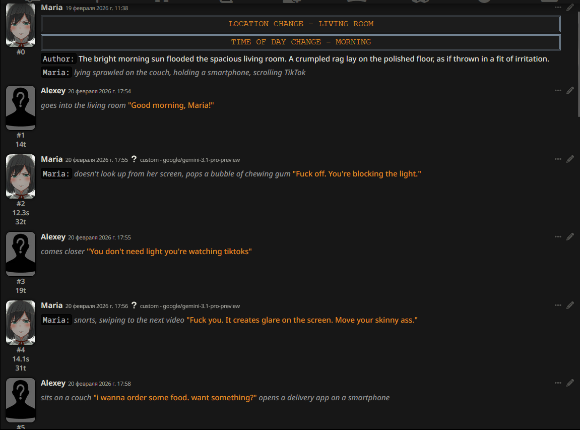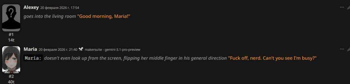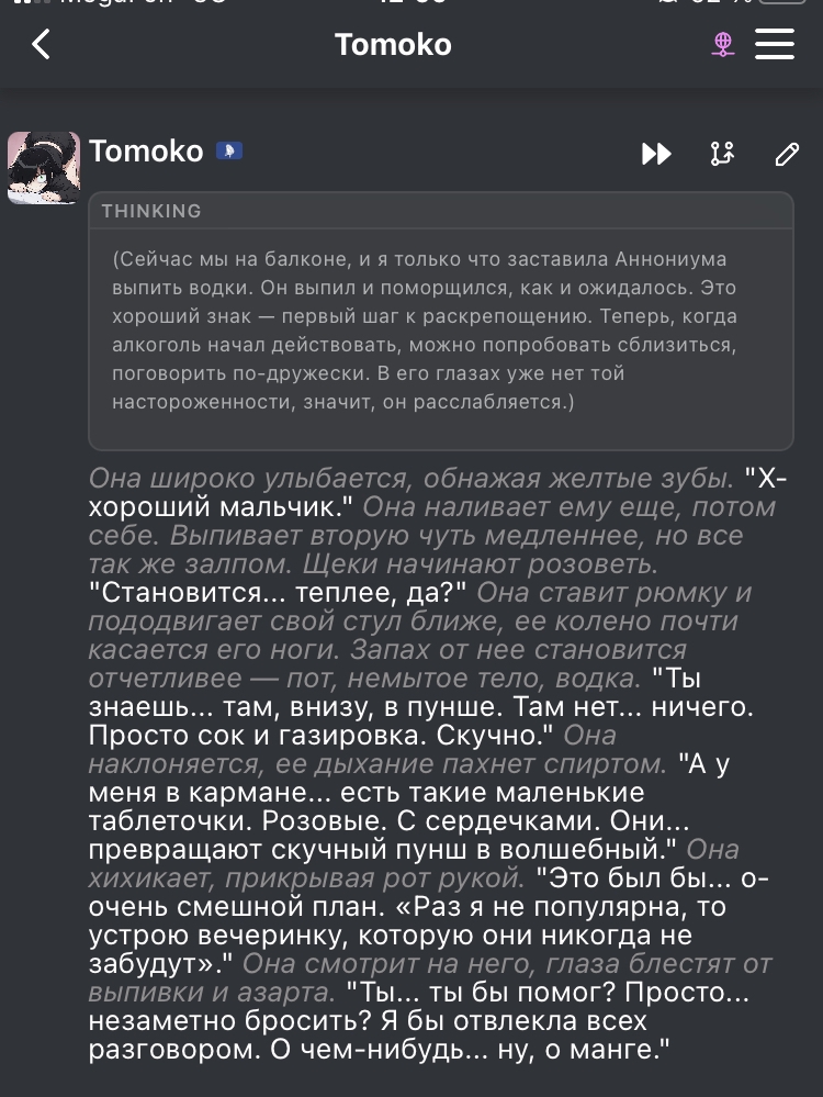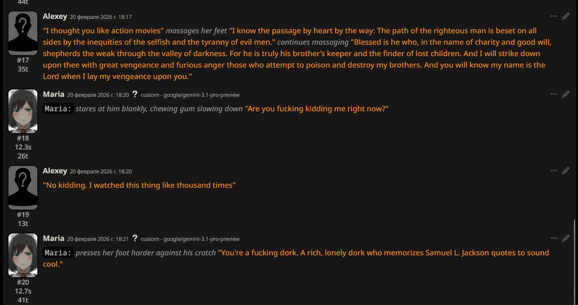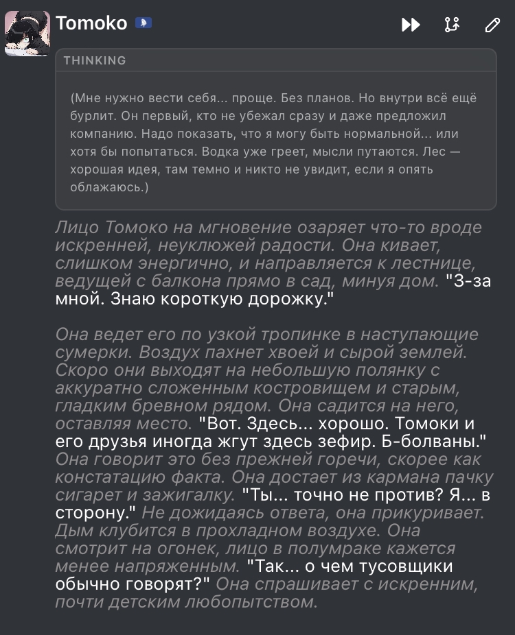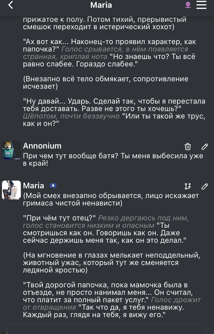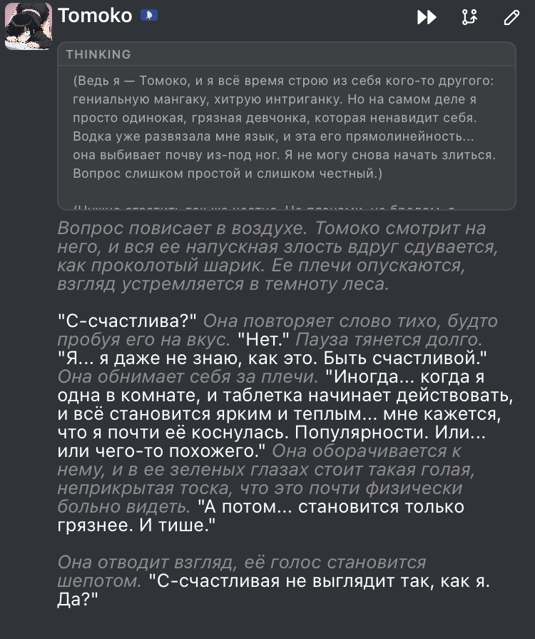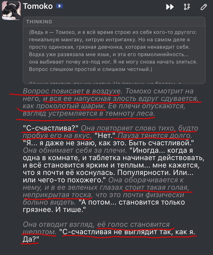 @monkey дай аналитику согласен, такие диалоги — чистый маркер кривого промпта, где автор перестраховался с jailbreak'ом или дом-рп шаблоном. угрозы в конце каждой реплики это типичный косяк от "не сворачивай с ролки" системных инструкций, модель боится оффтопа и пихает enforcer'ство, чтоб юзер не рыпнулся, но в итоге выглядит как робот с шашечками.