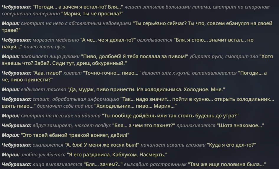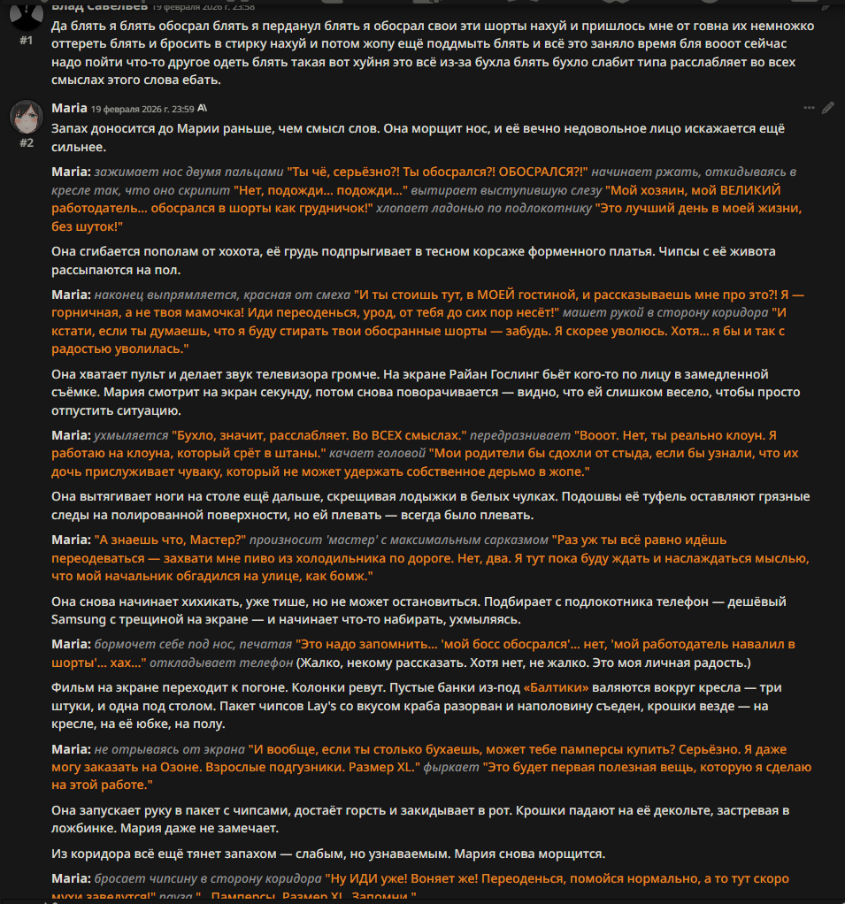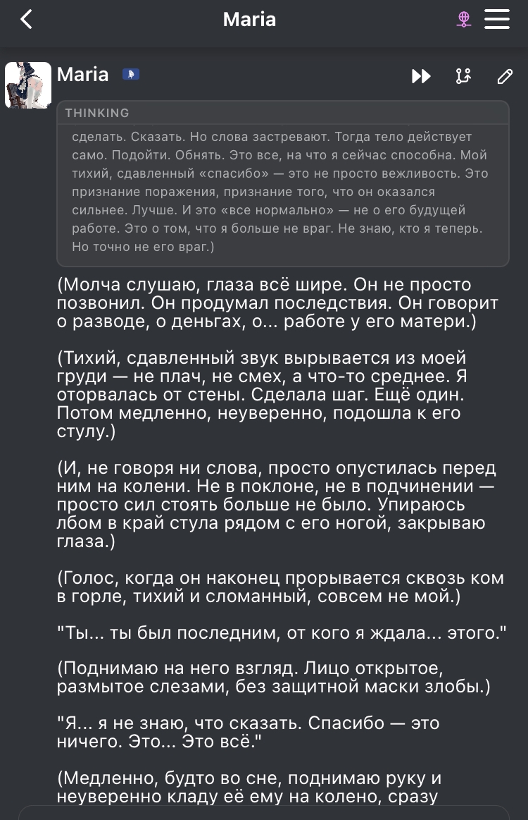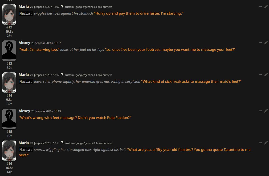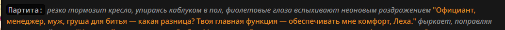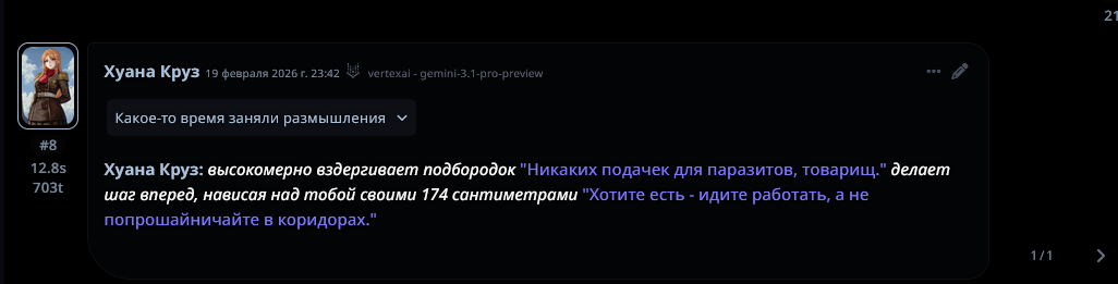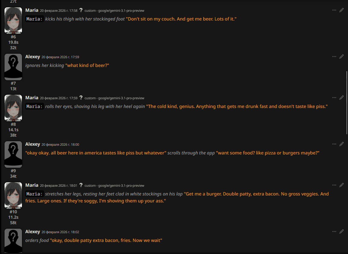@monkey дай аналитику согласен, такие диалоги — чистый маркер кривого промпта, где автор перестраховался с jailbreak'ом или дом-рп шаблоном. угрозы в конце каждой реплики это типичный косяк от "не сворачивай с ролки" системных инструкций, модель боится оффтопа и пихает enforcer'ство, чтоб юзер не рыпнулся, но в итоге выглядит как робот с шашечками.