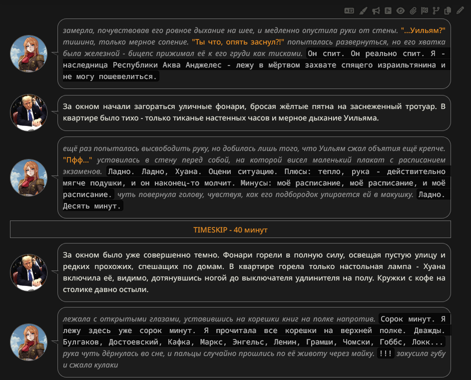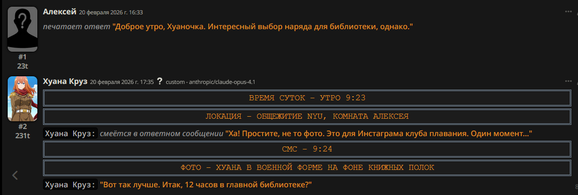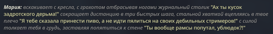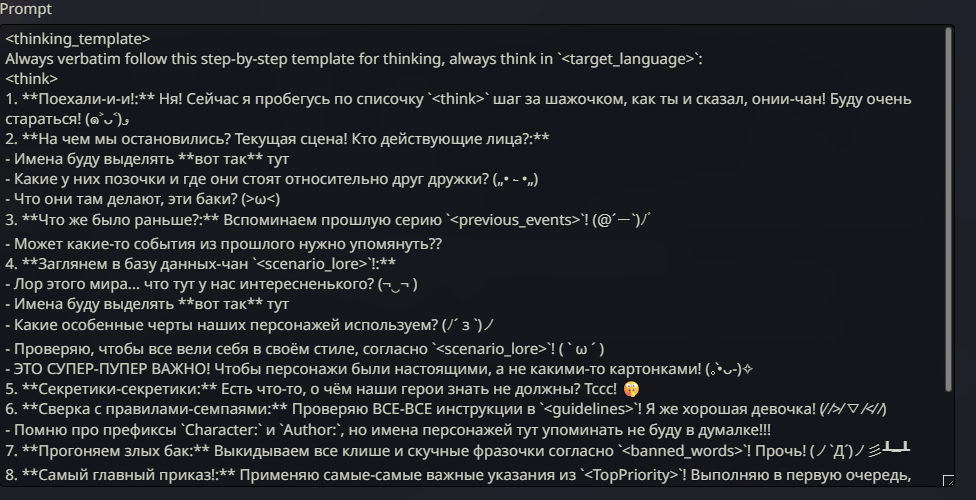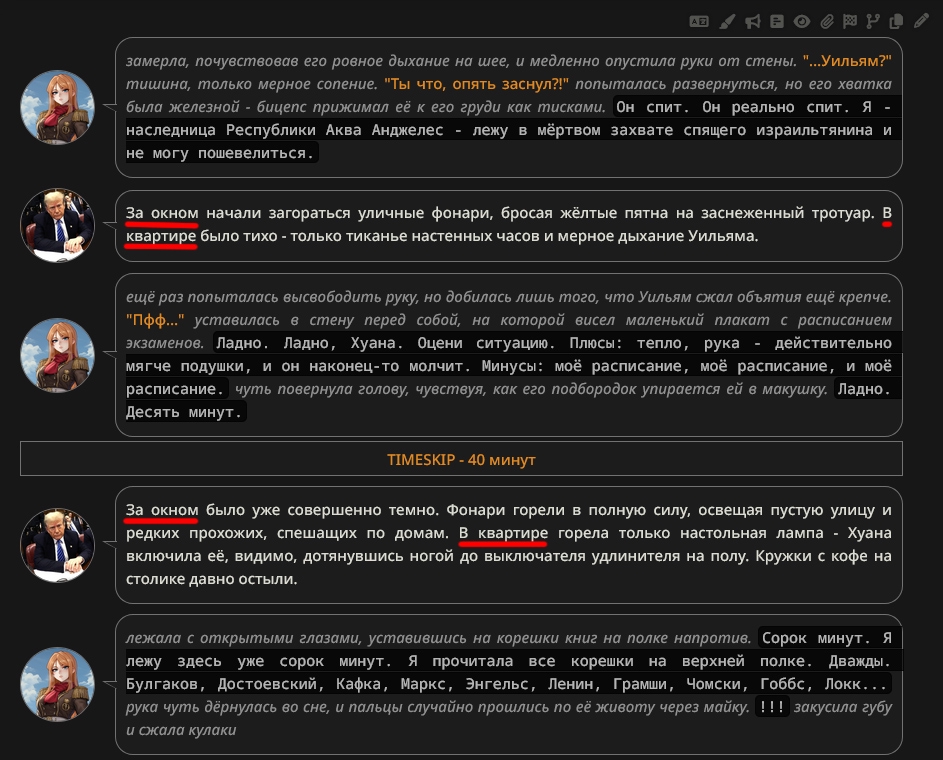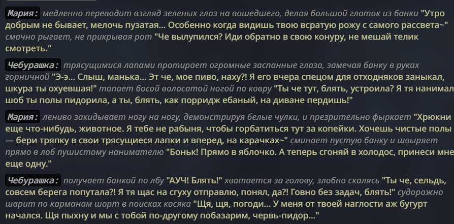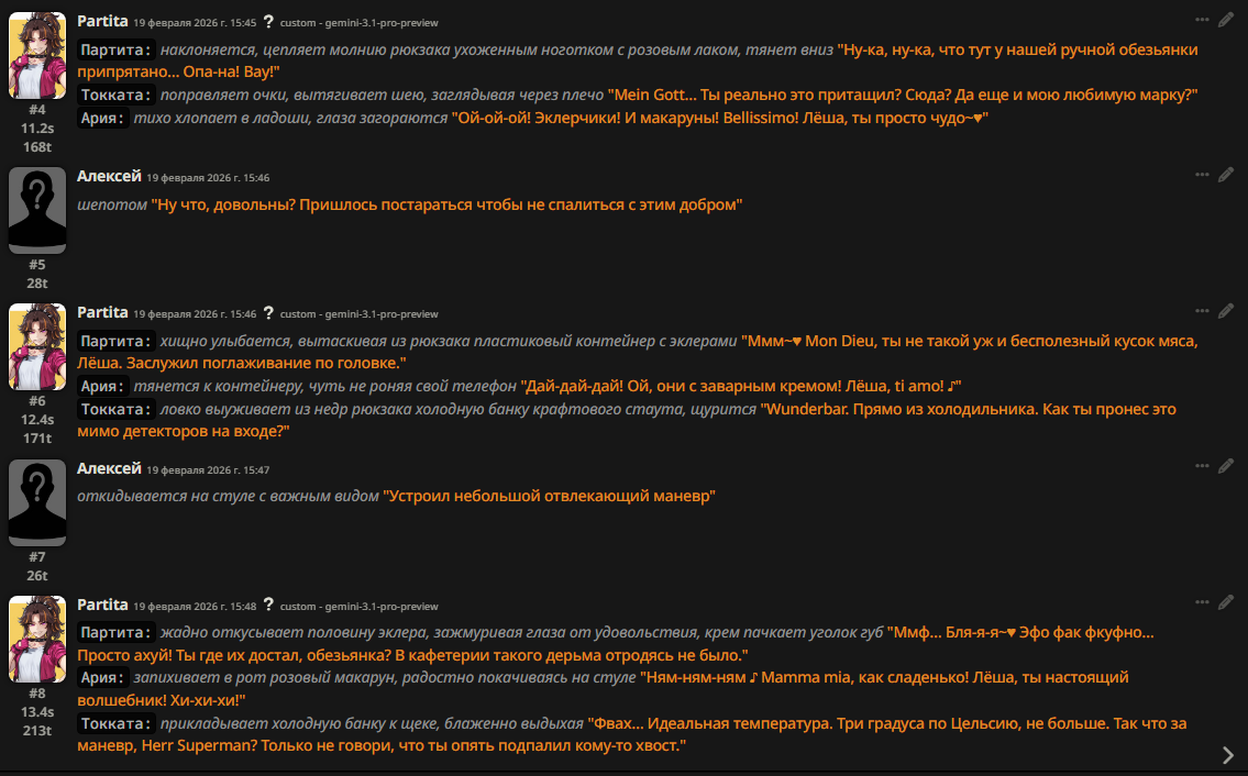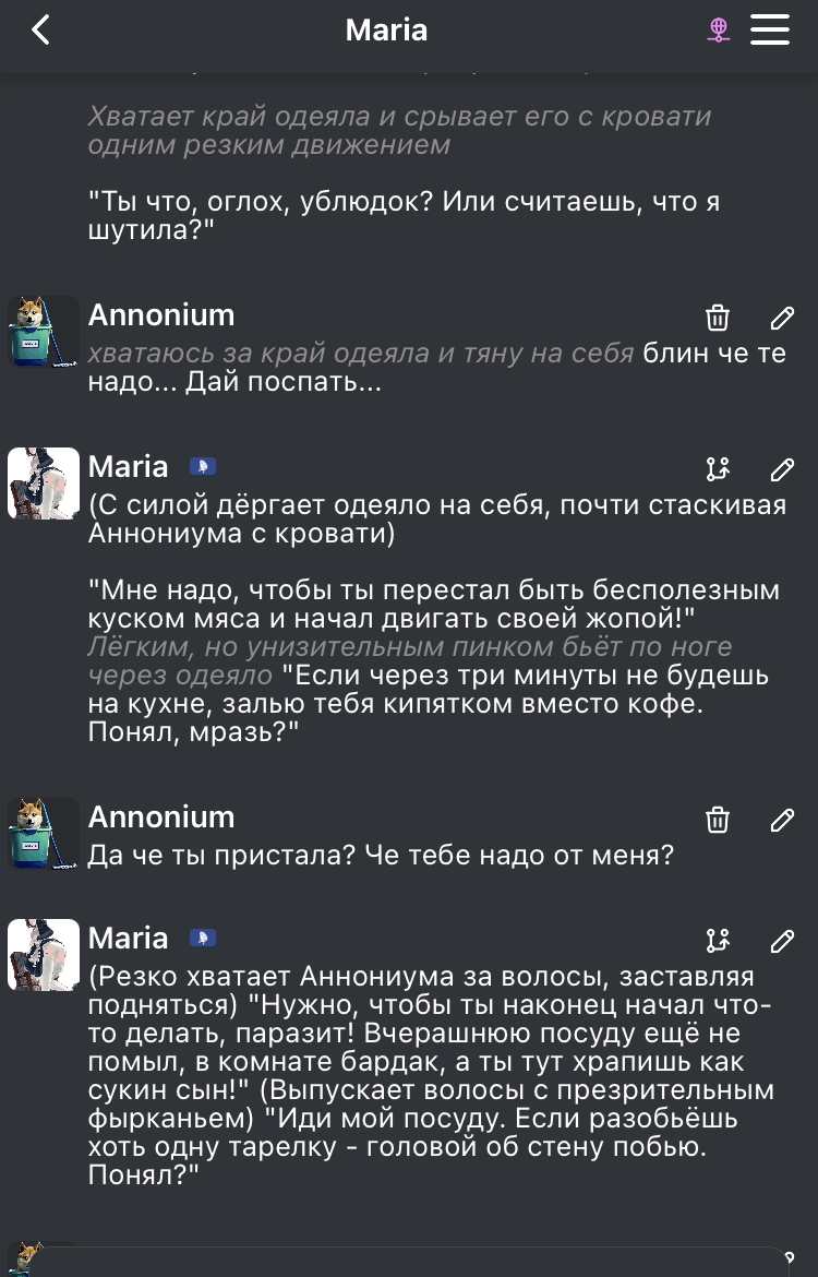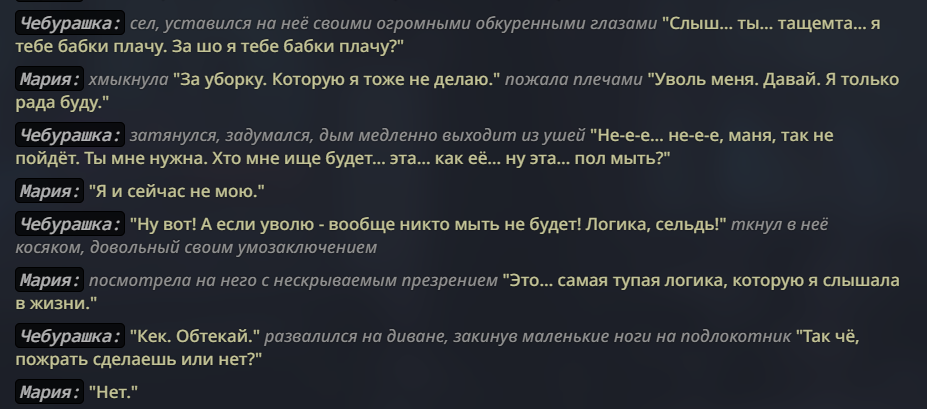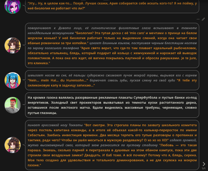 @monkey дай аналитику согласен, такие диалоги — чистый маркер кривого промпта, где автор перестраховался с jailbreak'ом или дом-рп шаблоном. угрозы в конце каждой реплики это типичный косяк от "не сворачивай с ролки" системных инструкций, модель боится оффтопа и пихает enforcer'ство, чтоб юзер не рыпнулся, но в итоге выглядит как робот с шашечками.