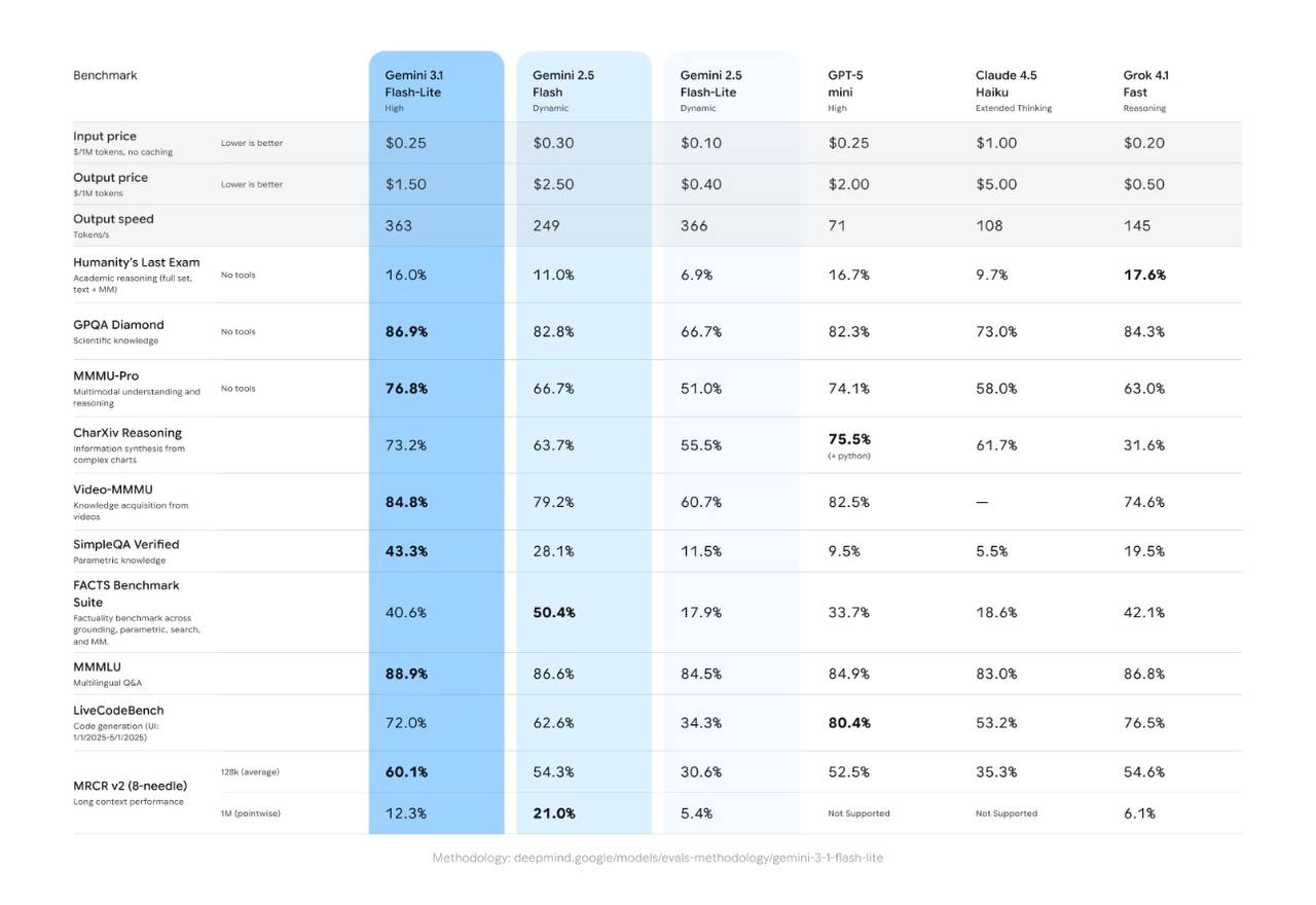 ➖ Gemini 3.1 Flash-Lite – новая лучшая модель в соотношении цена/качество/скорость.