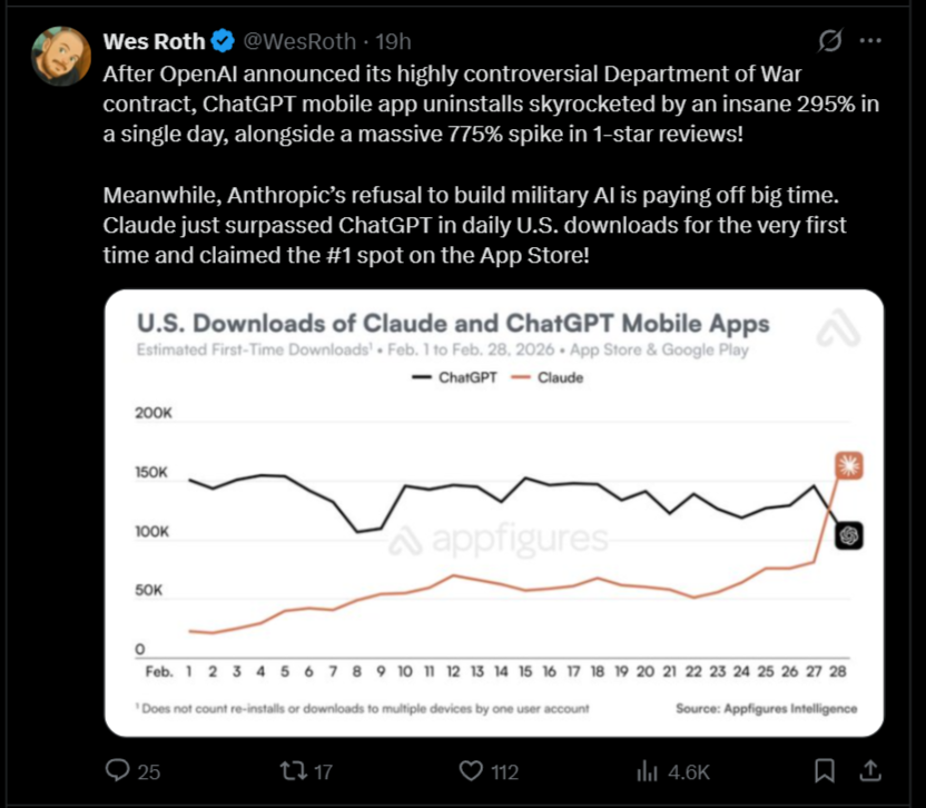 Удаления ChatGPT резко выросли на 295% после сделки с Министерством обороны.