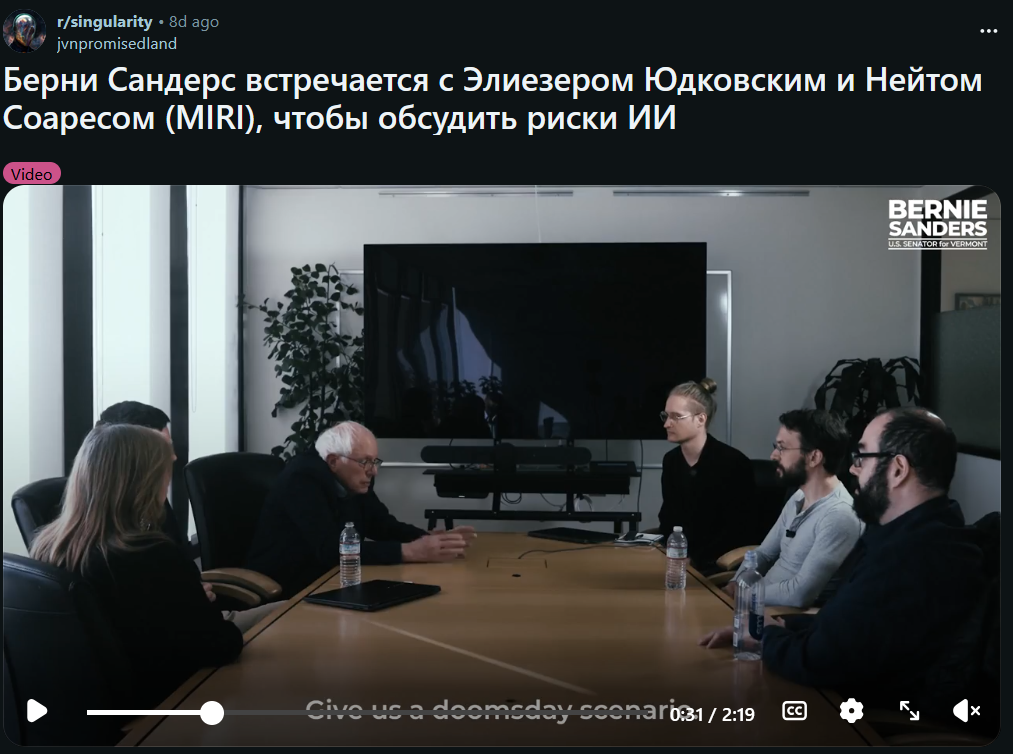 >>1551635 >долбоёбы пересмотрели терминатора и матрицу В каком-то смысле так. Гугли Eliezer Yudkowsky - это главный шизик-"думерист", который обещает 100% уничтожение всех людей и предлагает использовать ядерные ракеты по датацентрам как "меньшее зло". Приводит множество тупых аргументов, но больше - эмоциональных выражений, чисто психологических уловок и манипуляций, чтобы убедить в своей точке зрения. И убеждает некоторых - у него куча фанбоев. Натуральная секта шизиков, верящих в приход злого божества, которое их всех обязательно уничтожит.