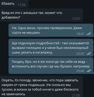 Ну, бляяяя... какие мантры, эээ! Мы все тут стабильные в любом состоянии на автопилоте до дома и такое всё. Но, в чём соль (земли), в том, что иной раз накрывает оно так - что ты и не чуешь, сука, подвоха. Вот ты стоишь весёлый (или засыпающий) в кругу друзей. А вот, раз, и ты уже в кругу зверей (по твоим сиюминутным понятиям). И в 90% случаев, ты на утро нихуя не помнишь. Моё личное мнение, это от того, что ты или только начал пить или давно не пил. Потому что профессионалы, такие как мой друг (я), уже знают эти все камни (подводочные) и стремятся их избежать.