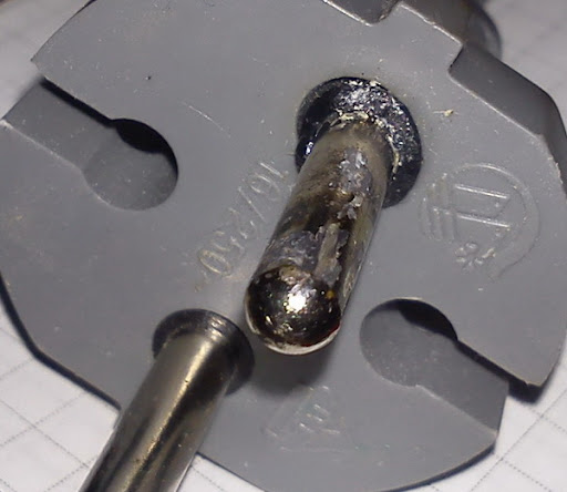 Следите за вилками и розетками, аноны. Я делаю так включил тэн, поработал минут 10-15, обесточил - проверили руками температуру контактов, и визуальное состояние. Пикрилейтед - признаки перегрева, следствие плохого контакта, показатель того что нужен ремонт.