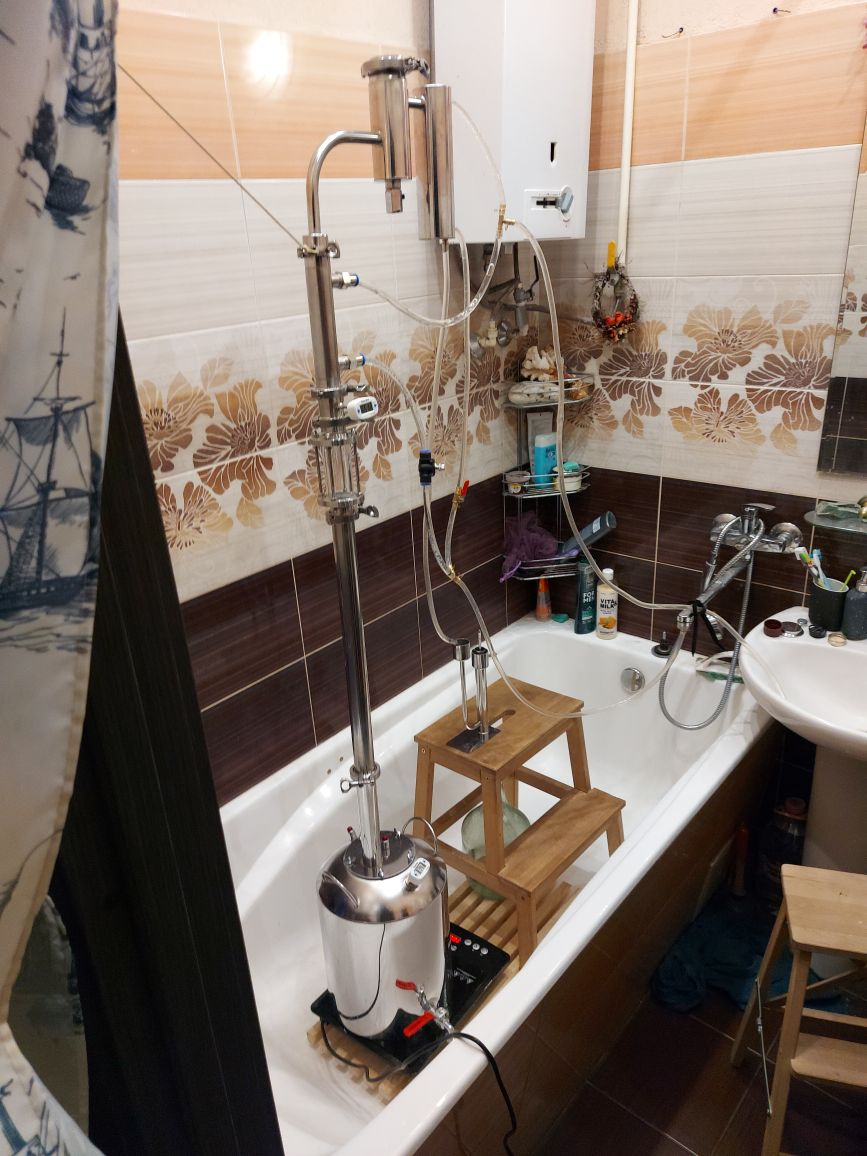 Аноны, решил тоже к вам вкатиться, принимайте в ряды. Аппарат - подаренный товарищем в прошлом году "Финляндия Экстра" на 12 литров с сухопарником. Почти сразу же решил не мельчить, и купил царгу на 500мм с напивкой РПН нержой и деф. Брагу ставил на турбодрожжах, с 25 литров браги вышло где то 3-4 литра 94-градусного. Ароматизировал, используя сухопарник как джин корзину, вроде даже получалось. Планирую купить узел отбора комбинированный, бокакобовской конструкции. И, видимо, заняться утеплением бака и царги, так как плитки индукционной на 2 киловата, такое ощущение, что не хватает (либо слишком сильно включаю дефлегматор, либо слабо слишком набил царгу)