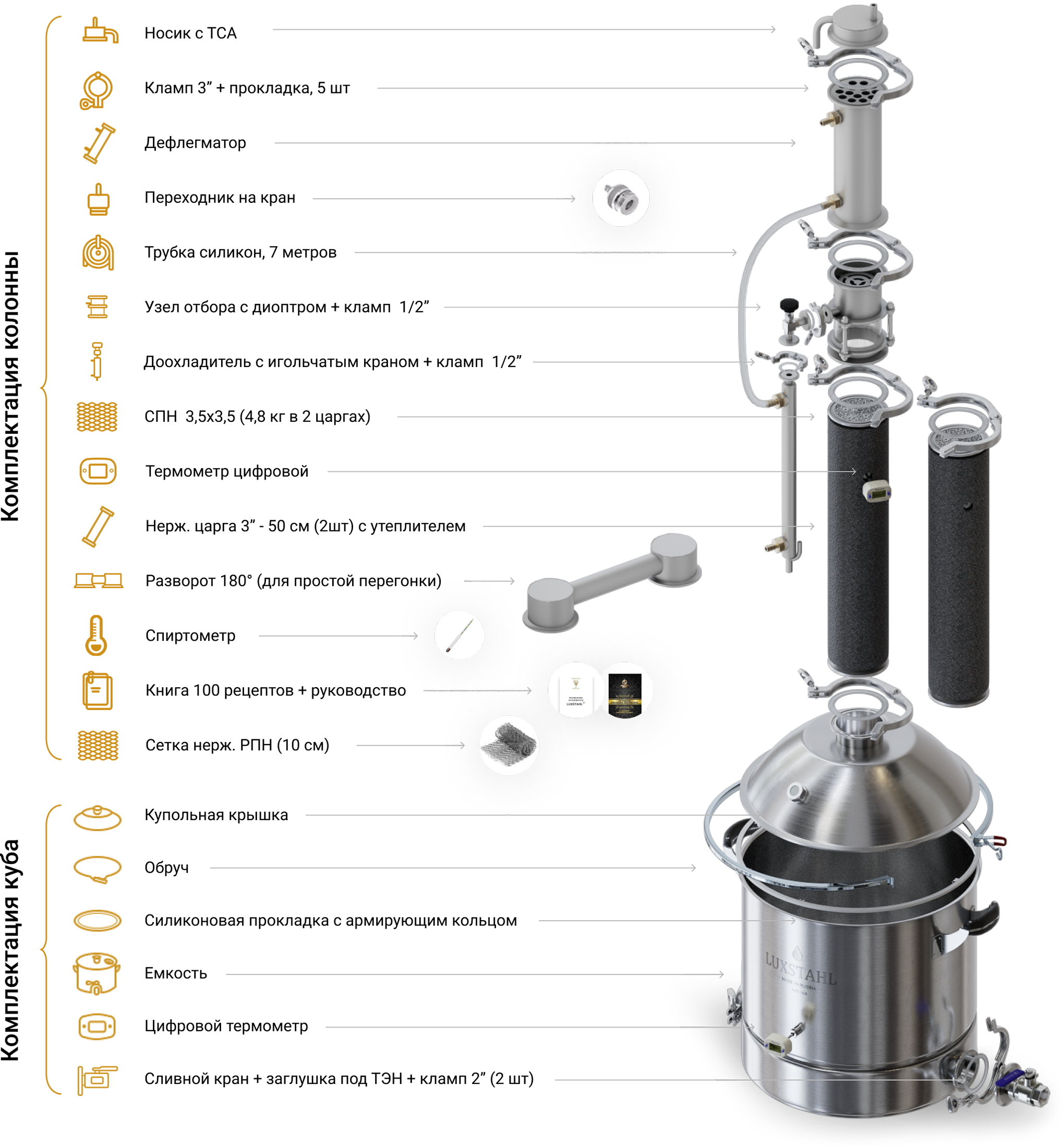Хочу купить LUXSTAHL 8M. На вид ничего так аппарат. Аппарат 3 дюйма, и типа как взгляд в будущее самогоноварения именно в 3 дюйма. Ну что модульная, сейчас все модульное. Ну это, там короче две царги в совокупности метр насадки получаем, и типа как,это заебись. Отбор по жидкости это вообще космос для меня, после отбора по подаче воды в дефлегматор, орошение царги, диоптр. Короче аппарат заебатый вроде как.