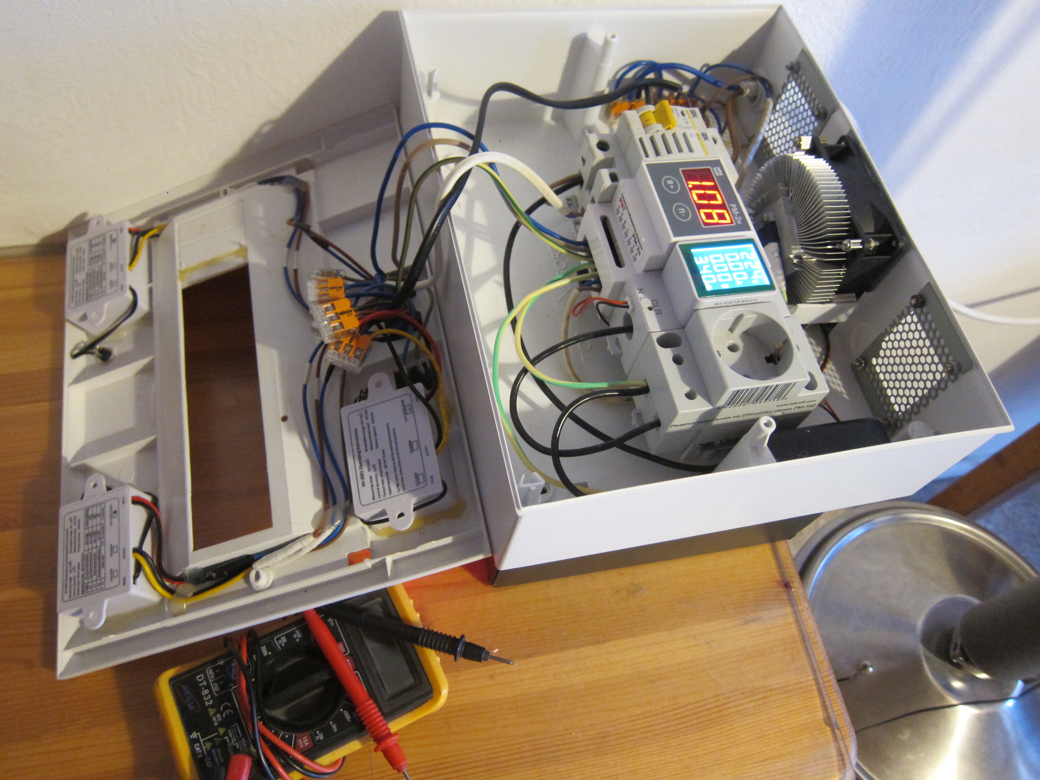 >>1600570 РМ-2 с симистором, ваттметр, блок питания с вентилятором и три термореле со звонком. Один щуп в куб, второй над дефлегматором (так как я отбираю выше дефлегматора, он нужен для его настройки) и третий под утепление царги.